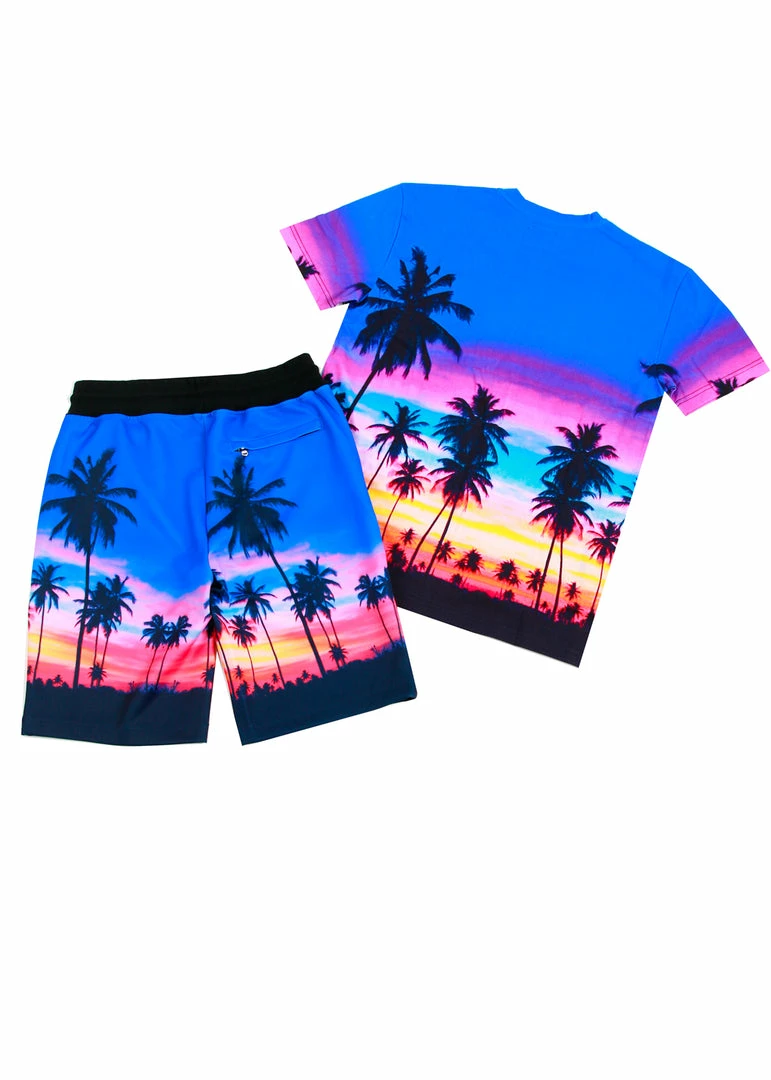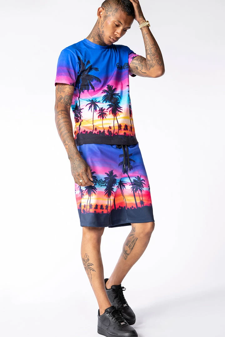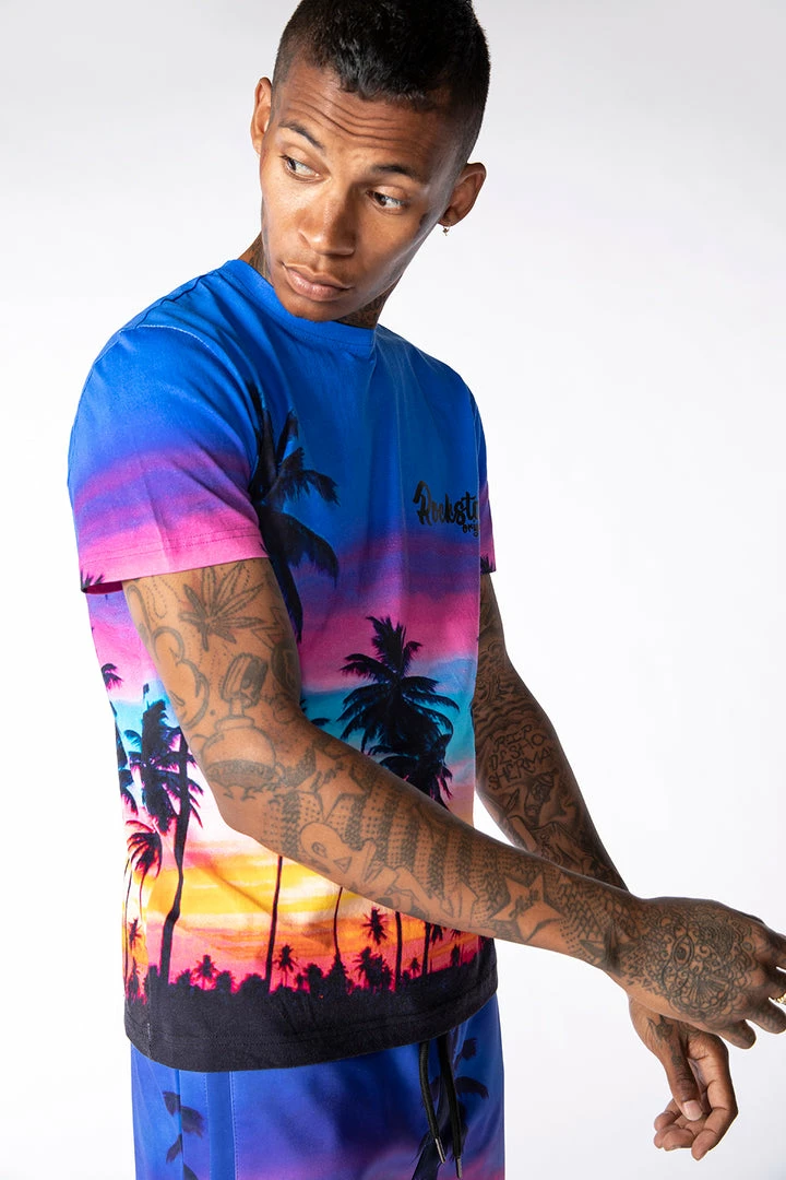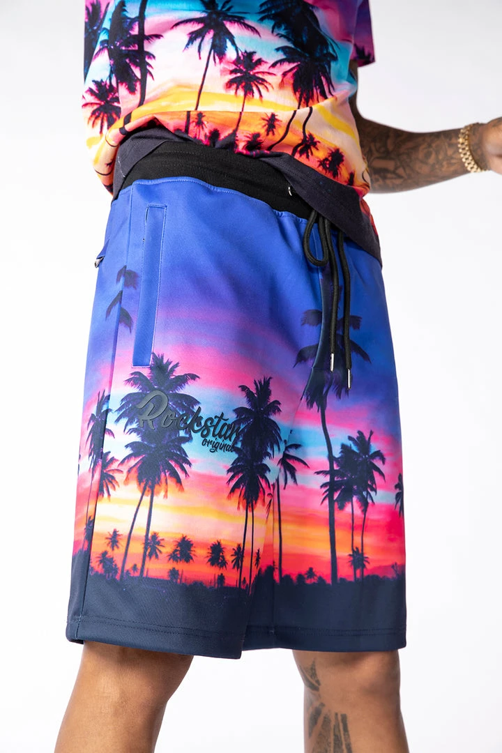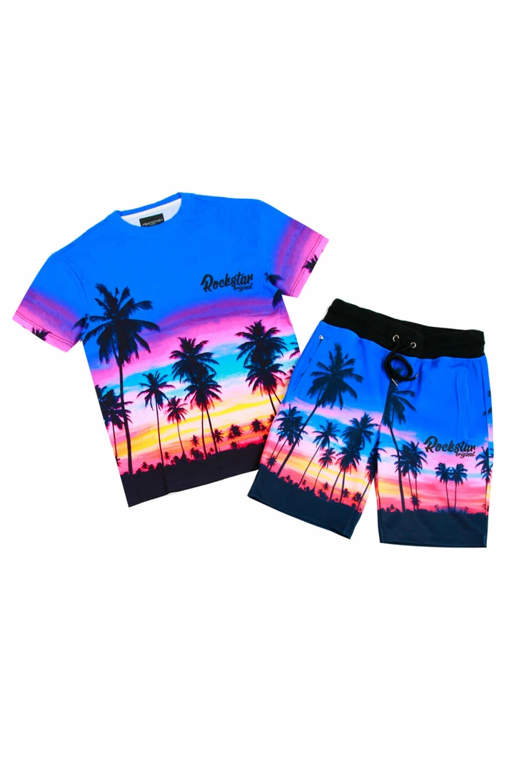 Rockstar Original Men’s two-piece short set in blue. Featuring printed RSO logos on the top and bottom with palm tree graphic designing throughout. Top accents a crew neckline and relaxed fit while bottoms accent a drawstring waistband with side pockets.