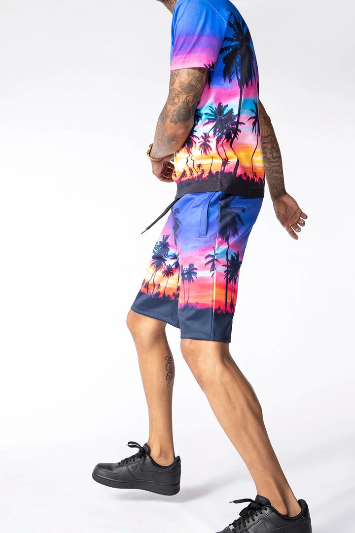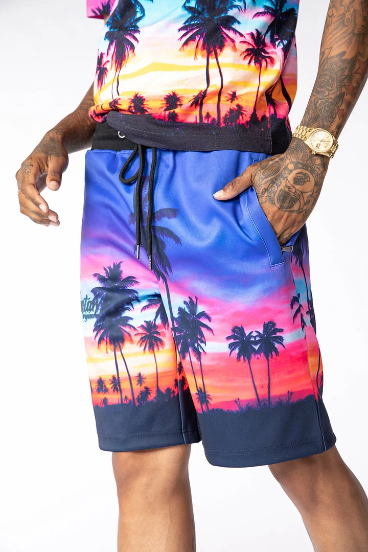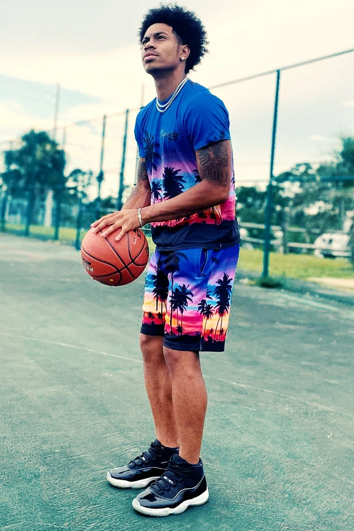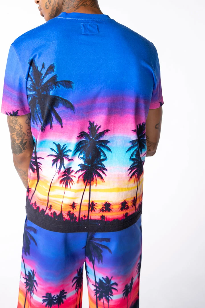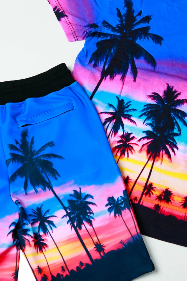 Rockstar Original Men’s two-piece short set in blue. Featuring printed RSO logos on the top and bottom with palm tree graphic designing throughout. Top accents a crew neckline and relaxed fit while bottoms accent a drawstring waistband with side pockets.