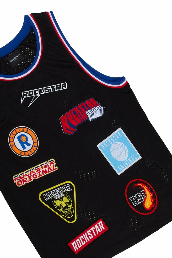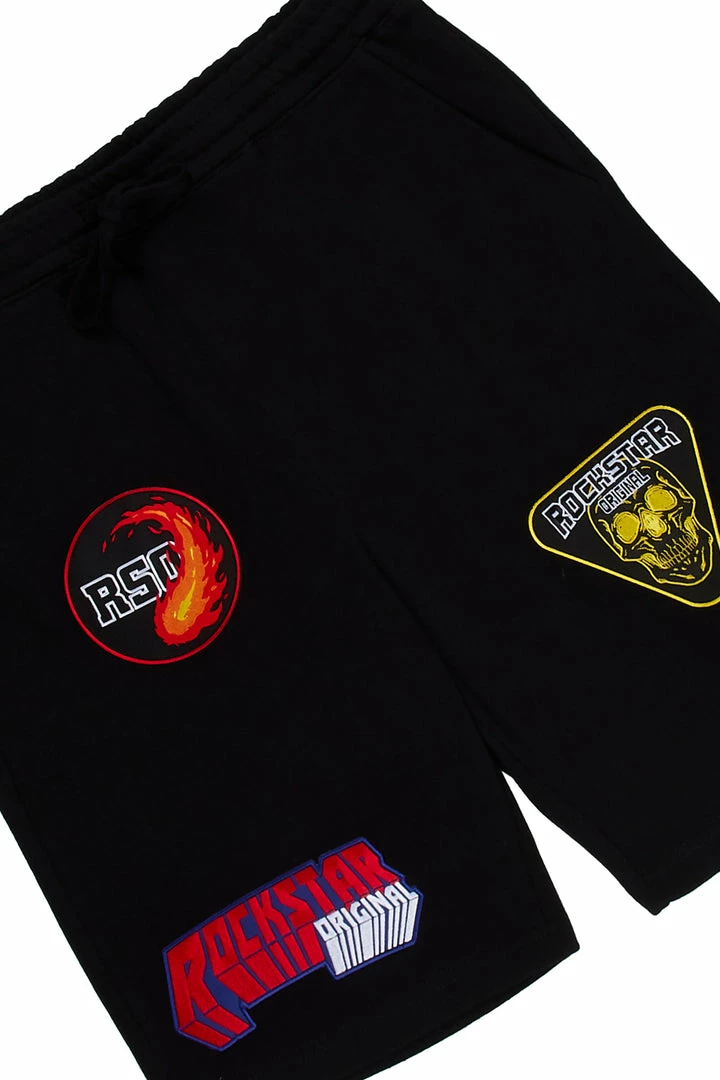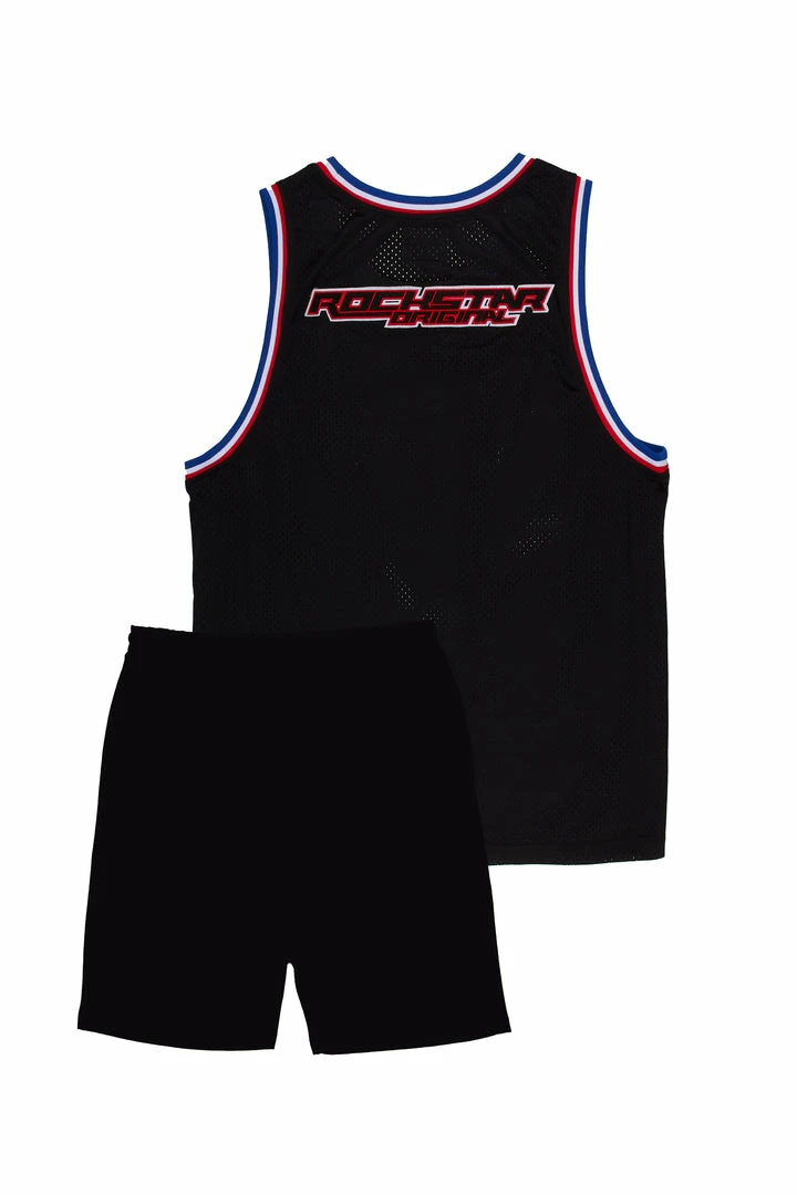 Rockstar Original Men’s two-piece short set inย black. Featuring embroidered RSO logos on the top and bottoms with varsity graphics to match. Jersey accents rib knit sleeveless arms and neckline with mesh fabricย while bottoms accent a ribbed drawstring waistband with pockets and a relaxed fit.