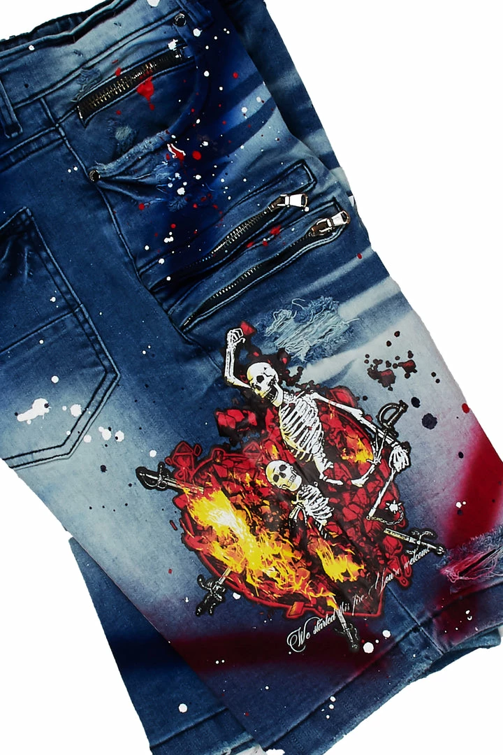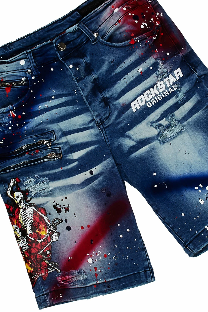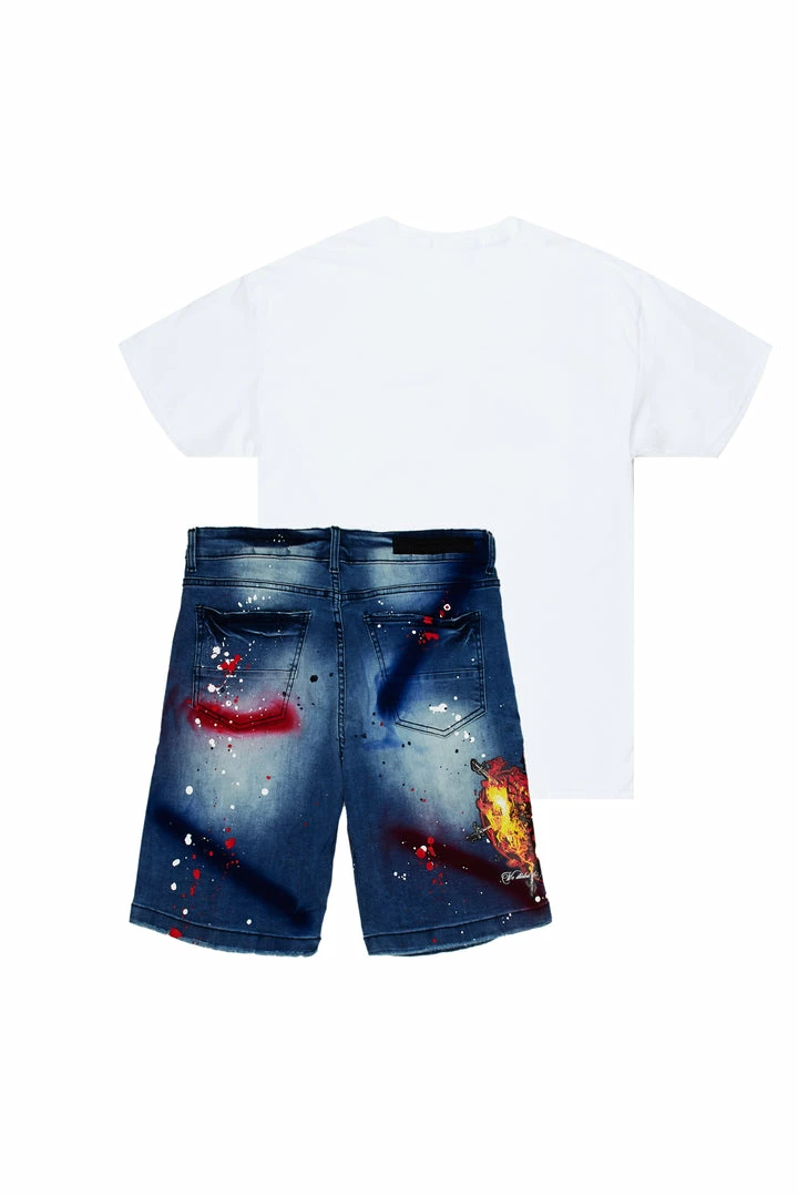 Rockstar Original Men’s denim short set in white. Featuring printed RSO logos and skull graphics throughout. Tee accents a crew neckline and relaxed fit while shorts accent a high quality zipper coin pocket with a front button closure, custom paint detailing and premium cotton threading for style and comfort.
