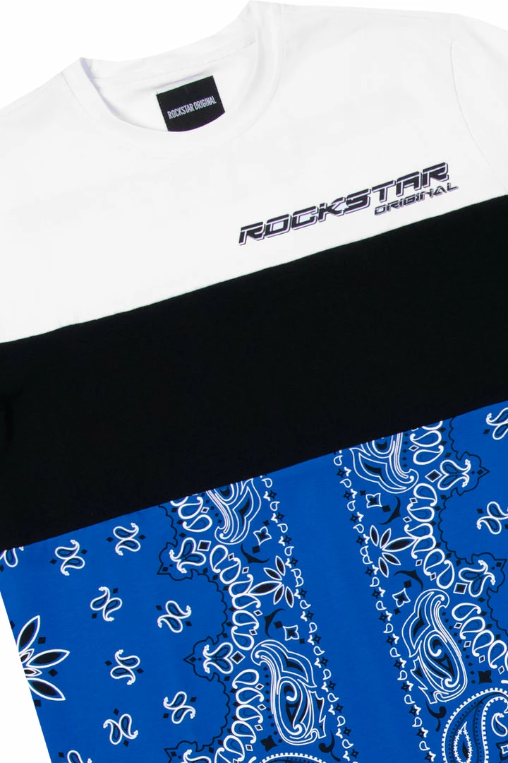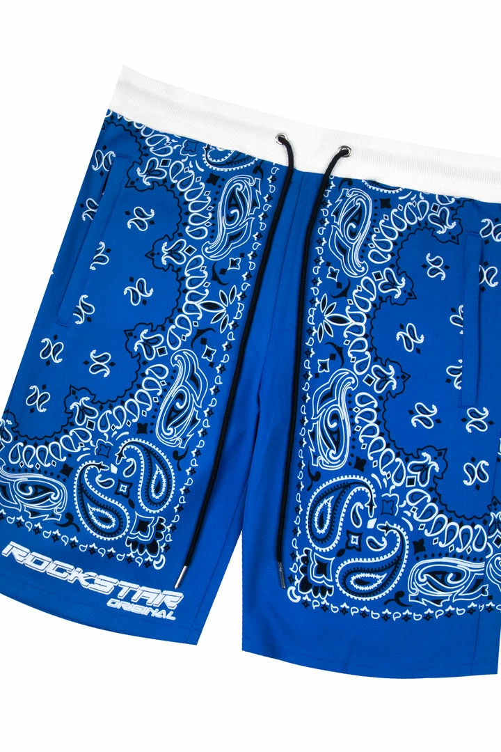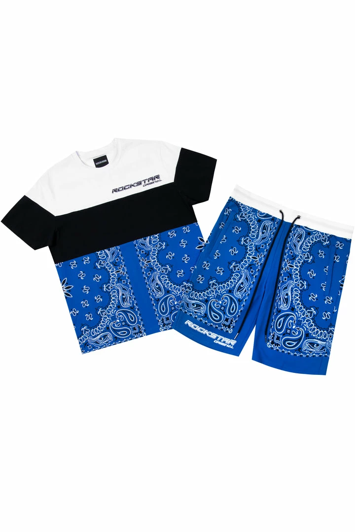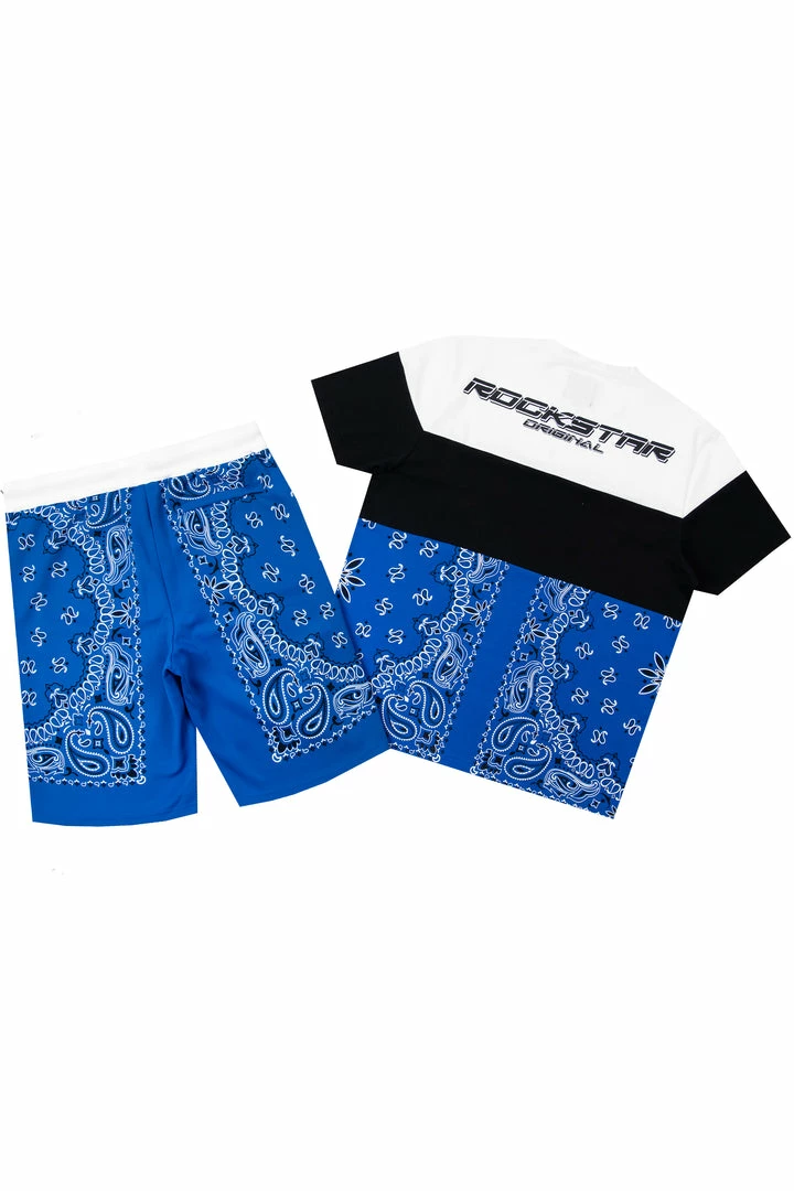 Rockstar Original men’s short tracksuitย set featuring a two-pieceย teeย and shorts.ย Teeย & Shorts feature a RSO logoย on the front with a color block design and paisley print all throughout. High qualityย zipper closure with drawstring waistband.