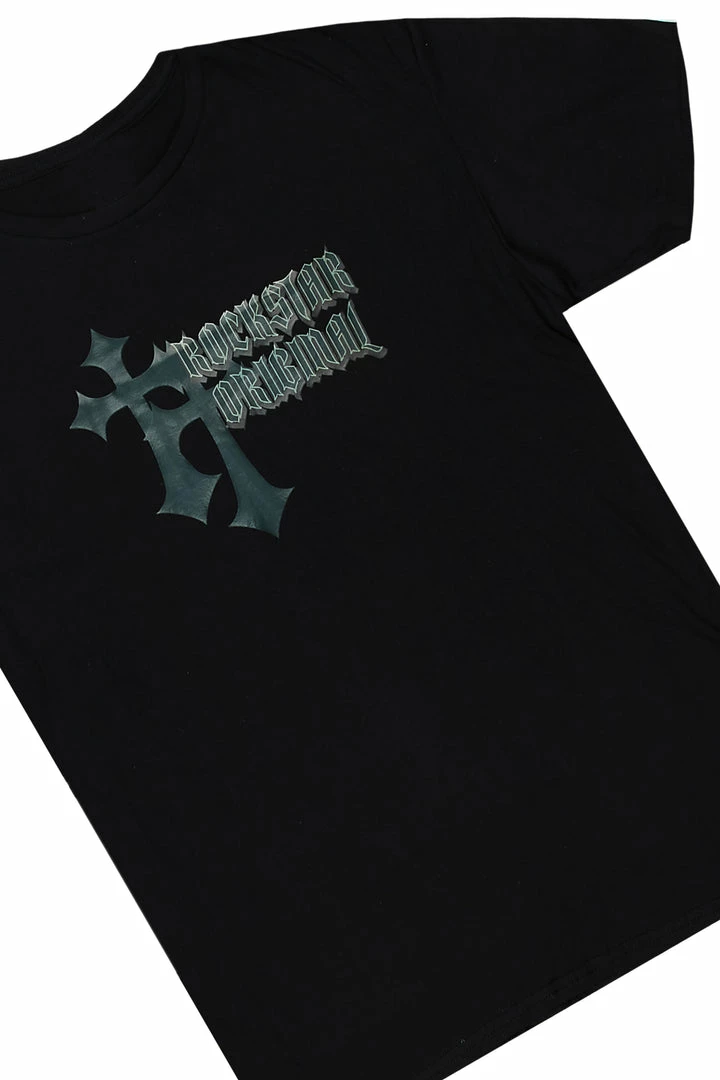 Rockstar Original Men’s denim short set in black. Featuring a crewneck tee and denim shorts with printed cross graphics throughout. Shorts accent a high quality zipper coin pocket with a front button closure, bleached detailing, raw hems and premium cotton threading for style and comfort.