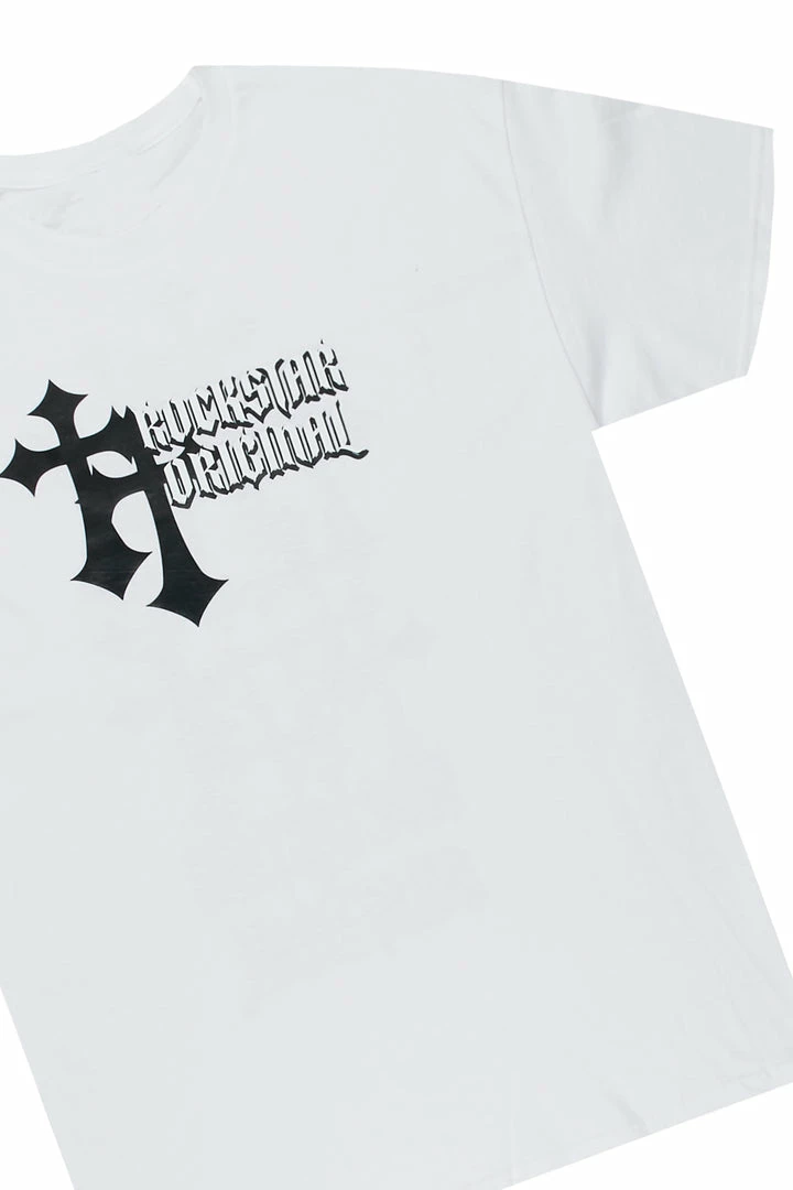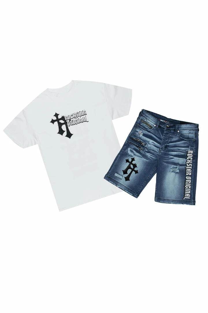 Rockstar Original Men’s denim short set in white. Featuring a crewneck tee and denim shorts in light wash with printed cross graphics throughout. Shorts accent a high quality zipper coin pocket with a front button closure, bleached detailing, raw hems and premium cotton threading for style and comfort.