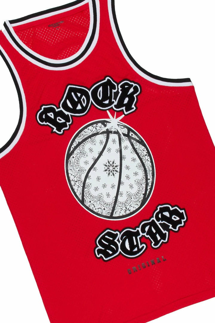 Rockstar Original Men’s two-piece short set in red. Featuring printed RSO logos on the top and bottoms with varsity graphics throughout to match. Jersey accents rib knit sleeveless arms and neckline with mesh fabric while bottoms accent a ribbed drawstring waistband with racer stripe designing and side pockets.