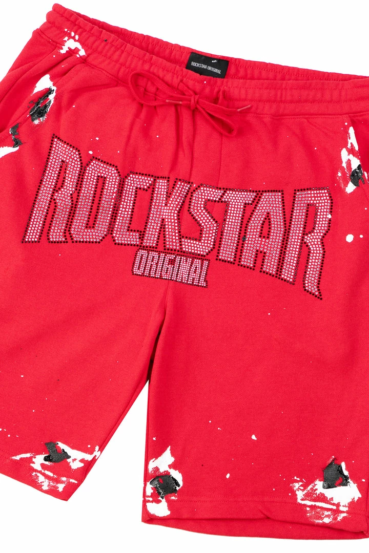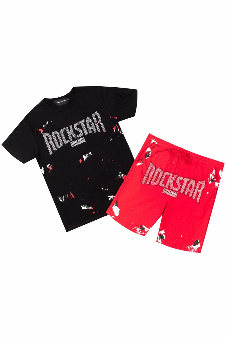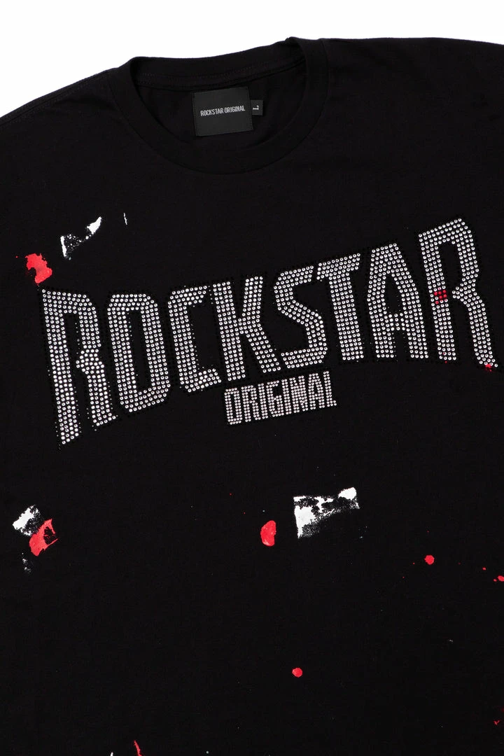 Rockstar Original men’s short tracksuitย set featuring a two-pieceย teeย and shorts.ย Teeย and Shortsย feature aย crystal designedย RSO logo withย paintย splatterย all throughout.ย Shortsย feature’s a drawstring waistband with zipper pockets.ย