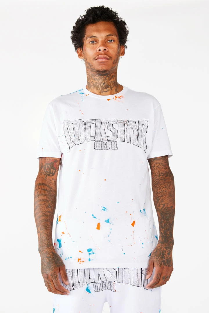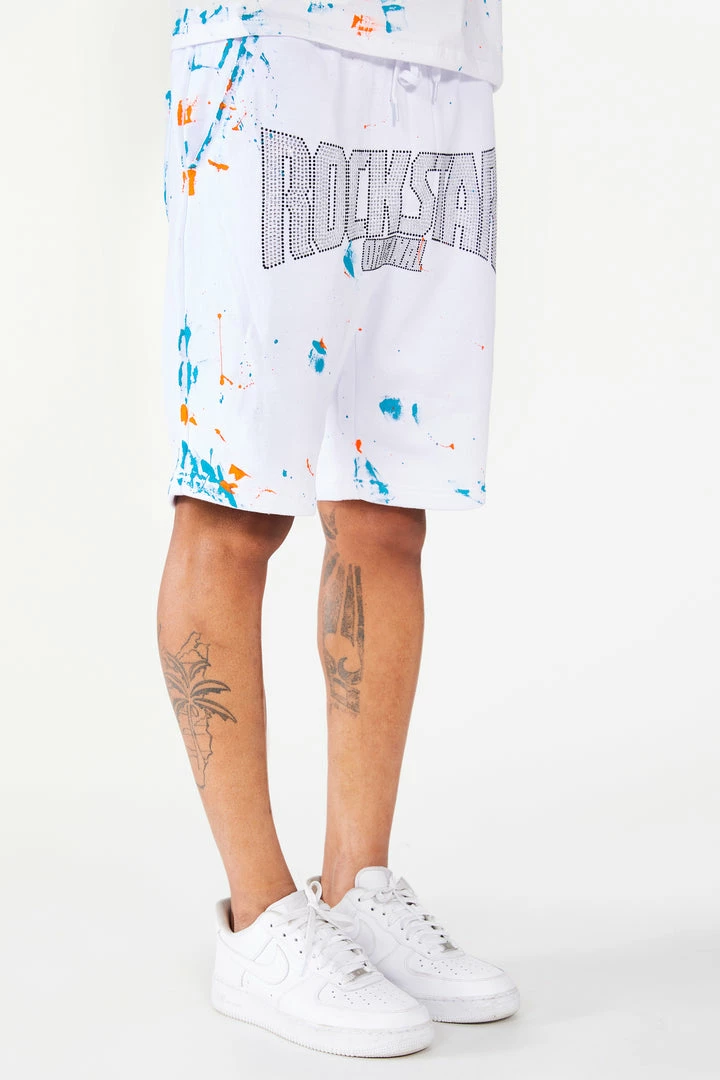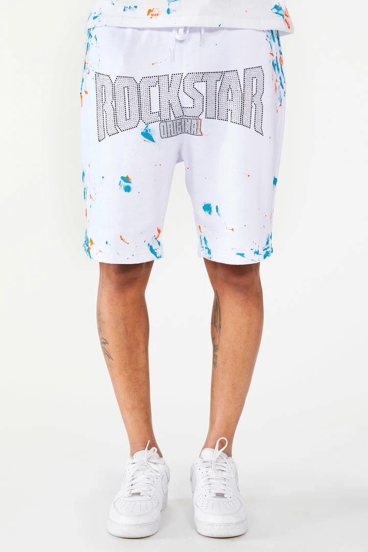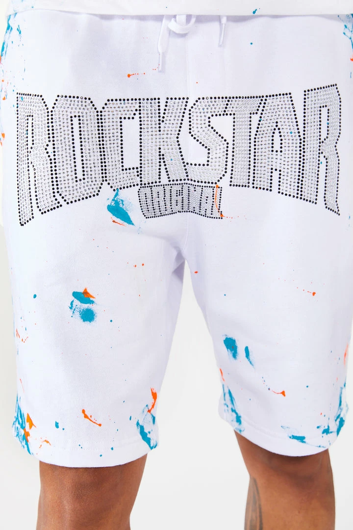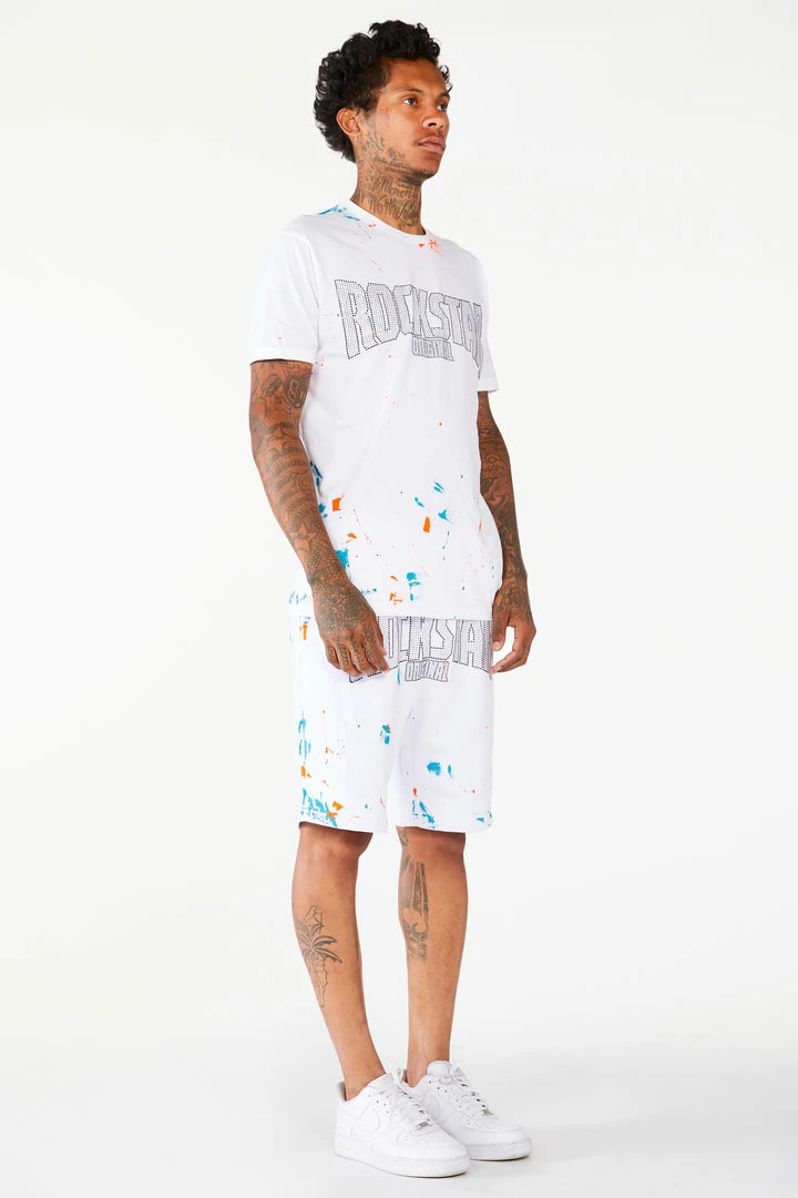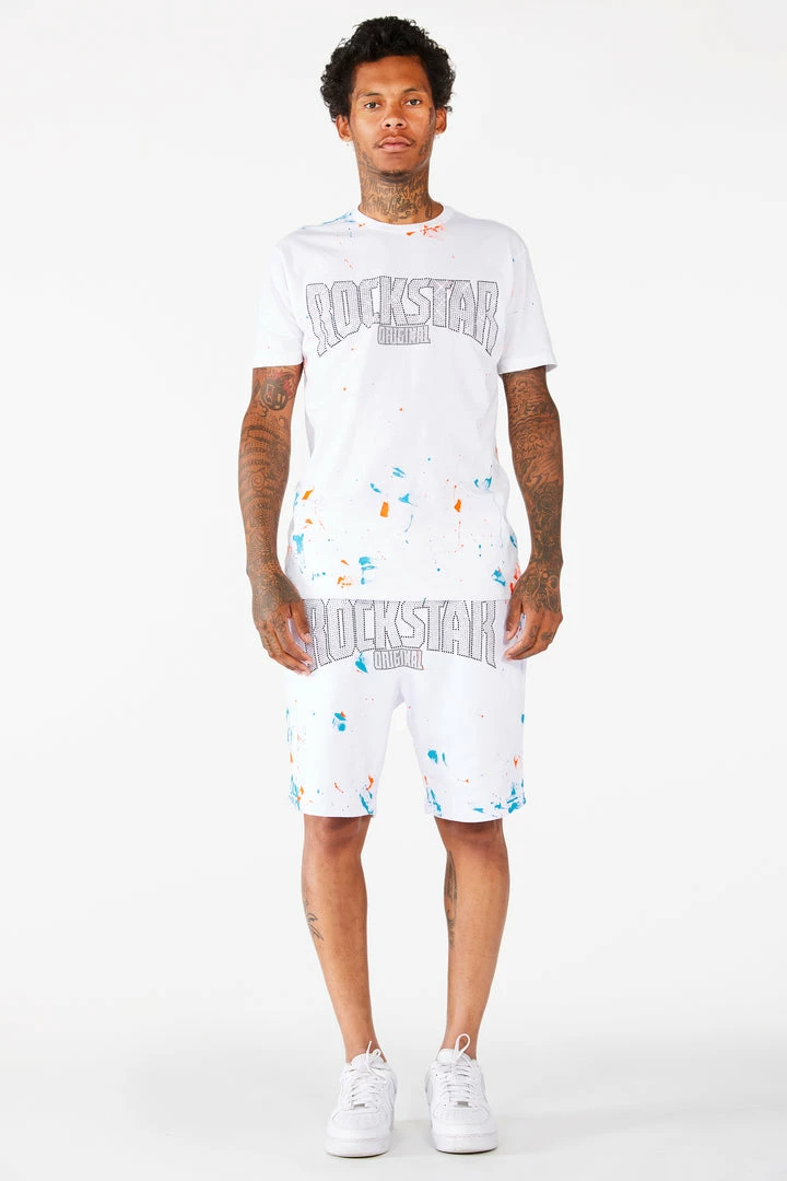 Rockstar Original men’s short tracksuitย set featuring a two-pieceย teeย and shorts.ย Teeย and Shortsย feature aย crystal designedย RSO logo withย paintย splatterย all throughout.ย Shortsย feature’s a drawstring waistband with zipper pockets.ย