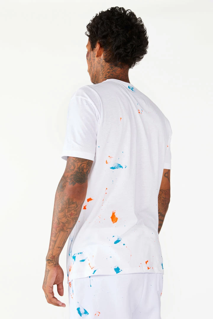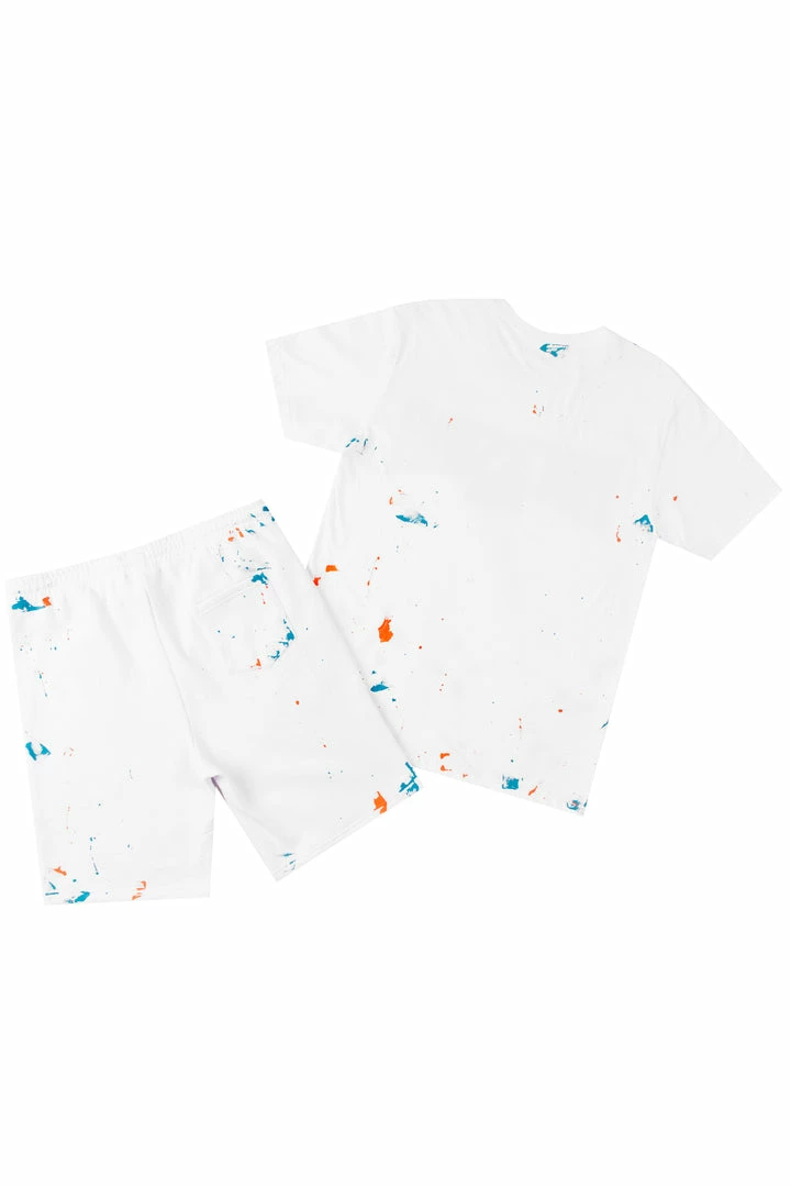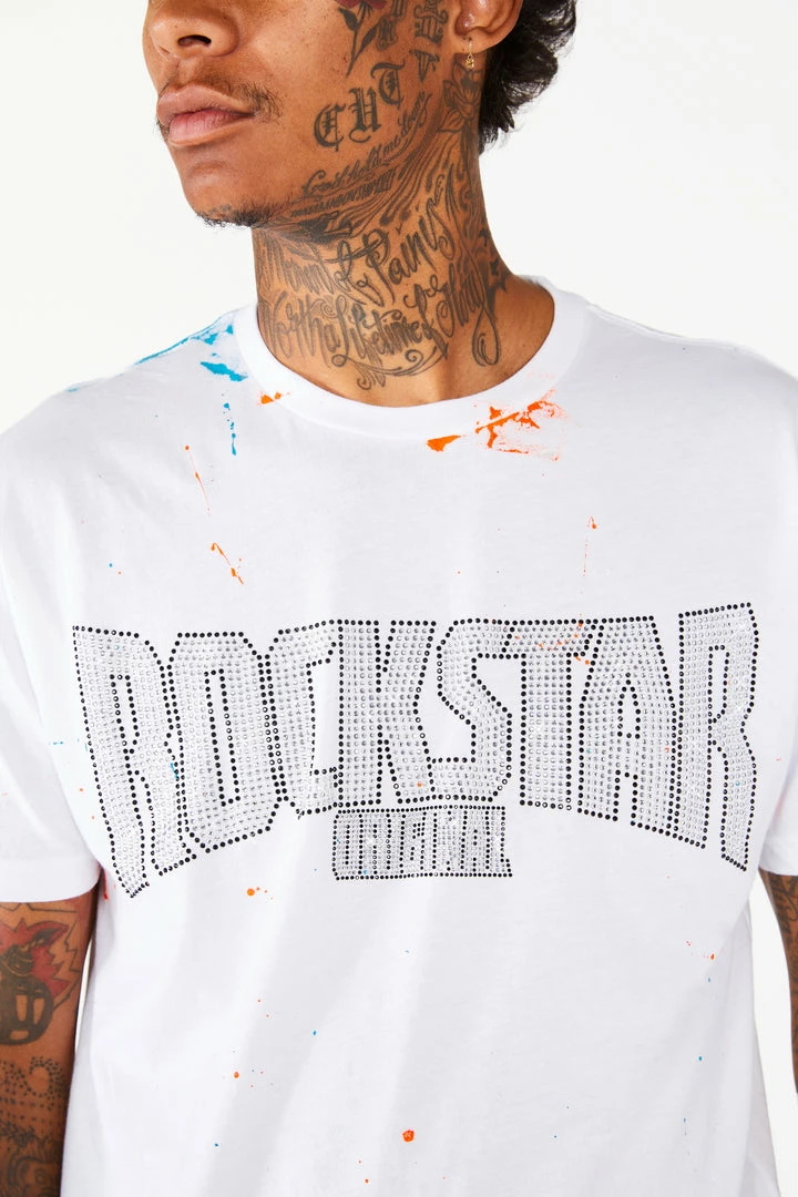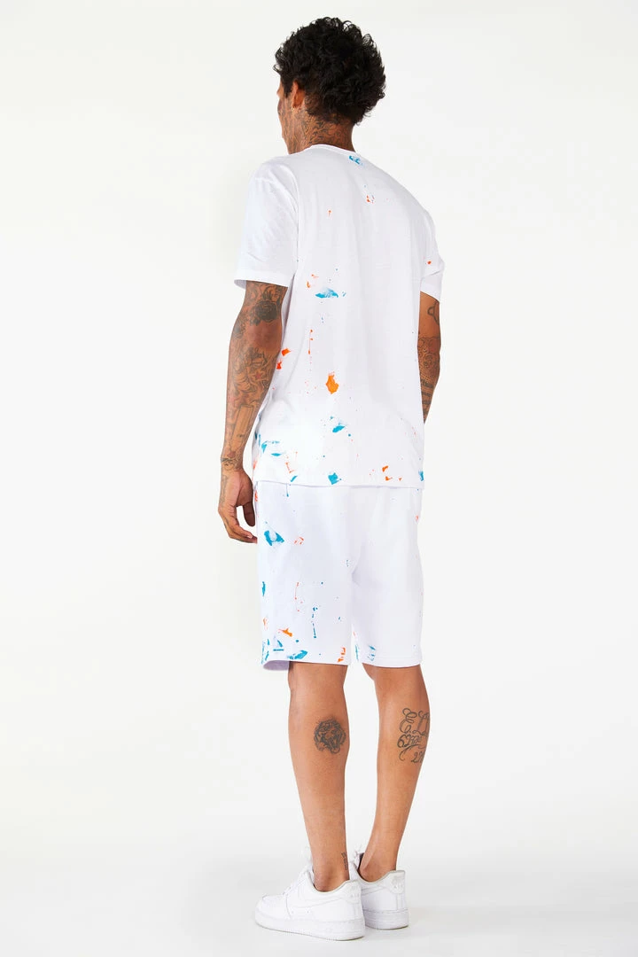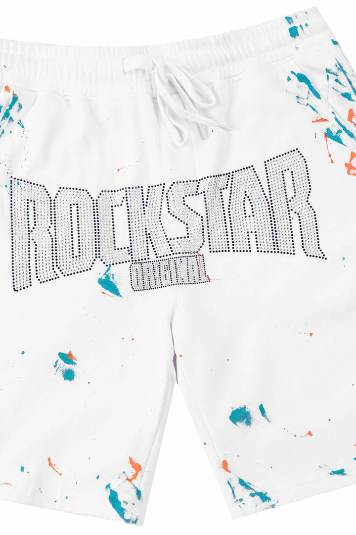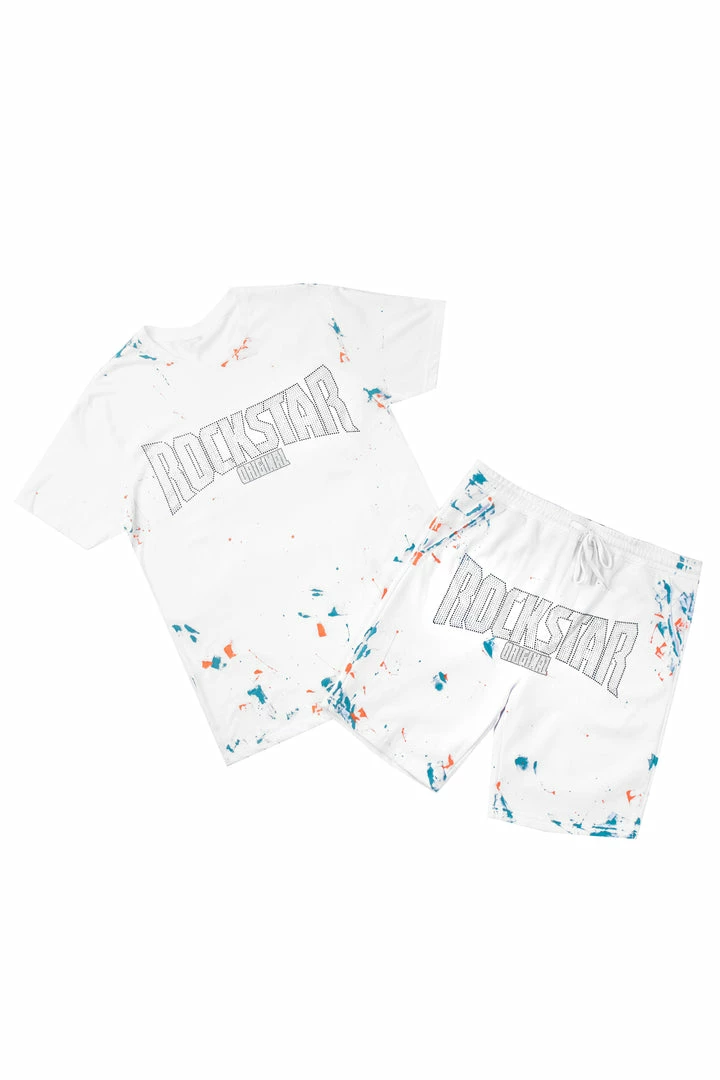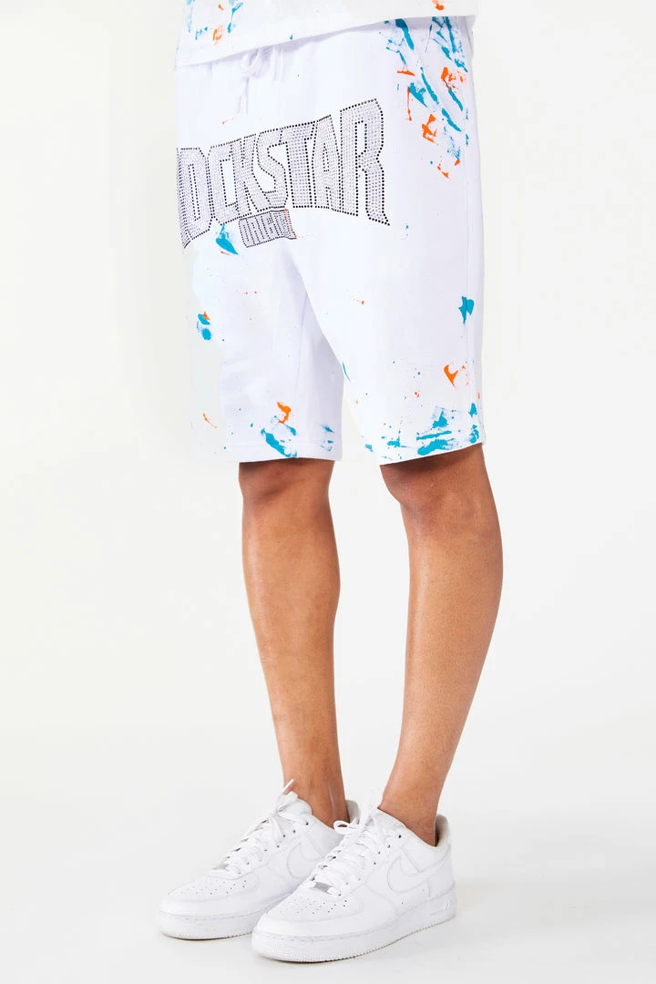 Rockstar Original men’s short tracksuitย set featuring a two-pieceย teeย and shorts.ย Teeย and Shortsย feature aย crystal designedย RSO logo withย paintย splatterย all throughout.ย Shortsย feature’s a drawstring waistband with zipper pockets.ย
