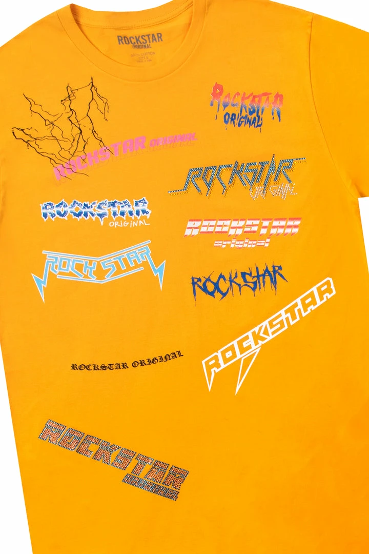 Rockstar Original men’s short tracksuit set featuring a two-piece tee and shorts. Tee & Shorts feature an assorted graphic printed RSO logo all over. Drawstring waistband and zipper pockets.