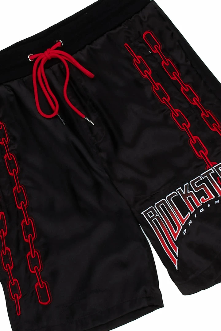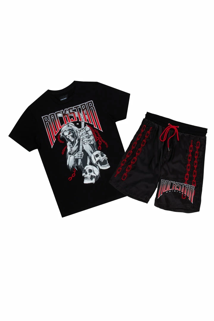 Rockstar Original Men’s two-piece short set in black. Featuring an embroidered RSO logo and embroidered details to match on the top and bottom. Top accents a printed graphic with a crew neckline and stretch material while bottoms accent a drawstring waistband, high quality zipper pockets and inner mesh lining.