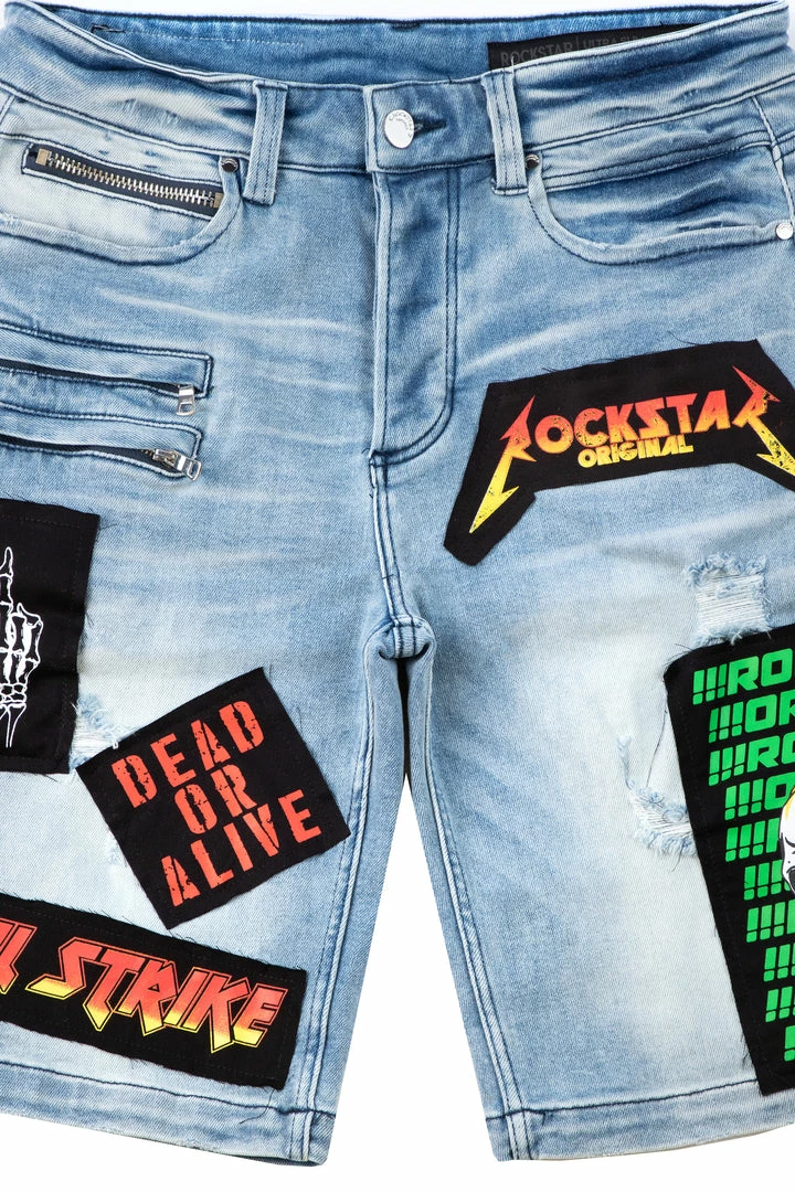 Rockstar Original men’s shorts featuring multi graphic printed patches all throughout. High quality zipper coin pocket.