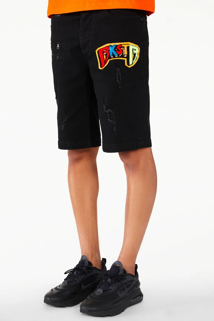 Rockstar Original men’s shorts featuring a featuring a multi colored embroidered fur patch RSO logo with a light wash. Zipper pockets with distressed details. High quality zipper coin pocket.