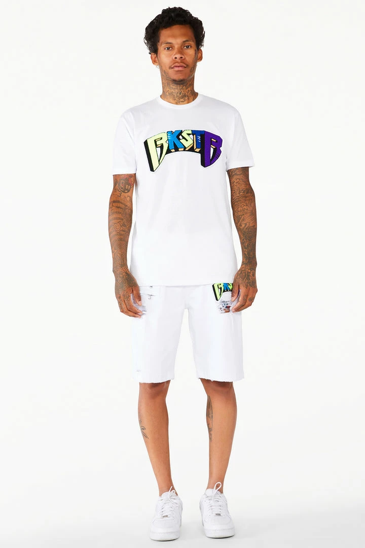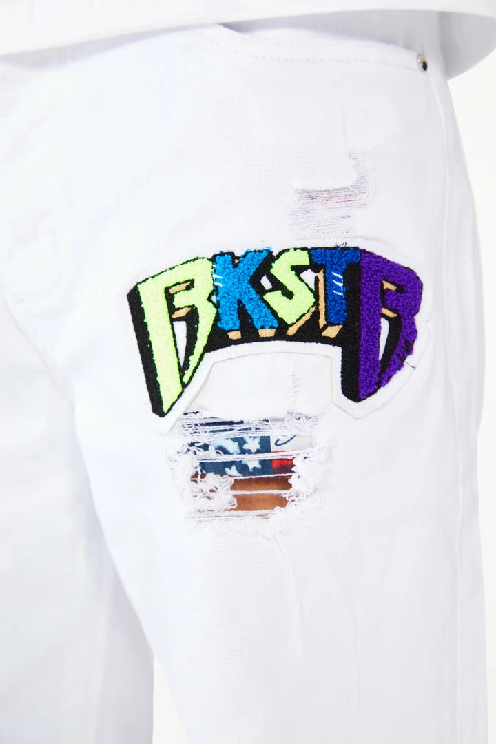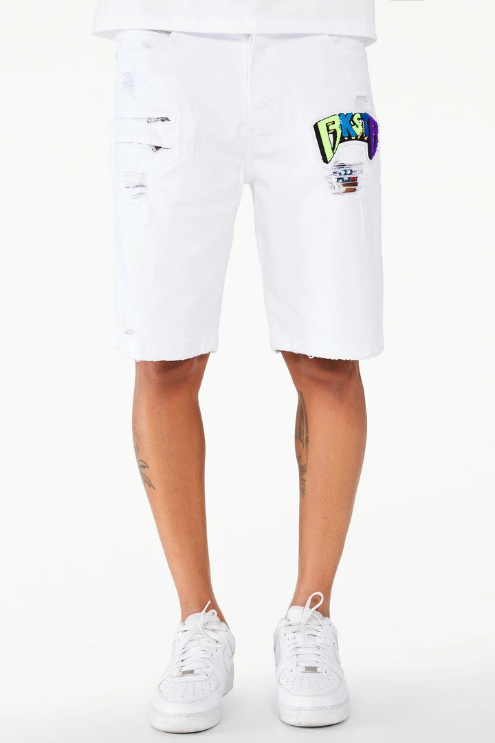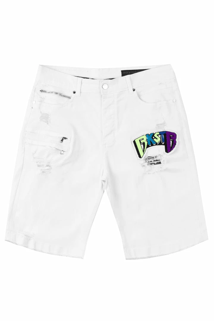 Rockstar Original men’s shorts featuring aย featuringย a multi colored embroidered fur patch RSO logo with a light wash. Zipper pockets with distressed details.ย High quality zipper coin pocket.