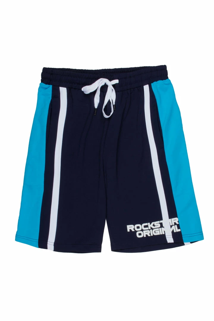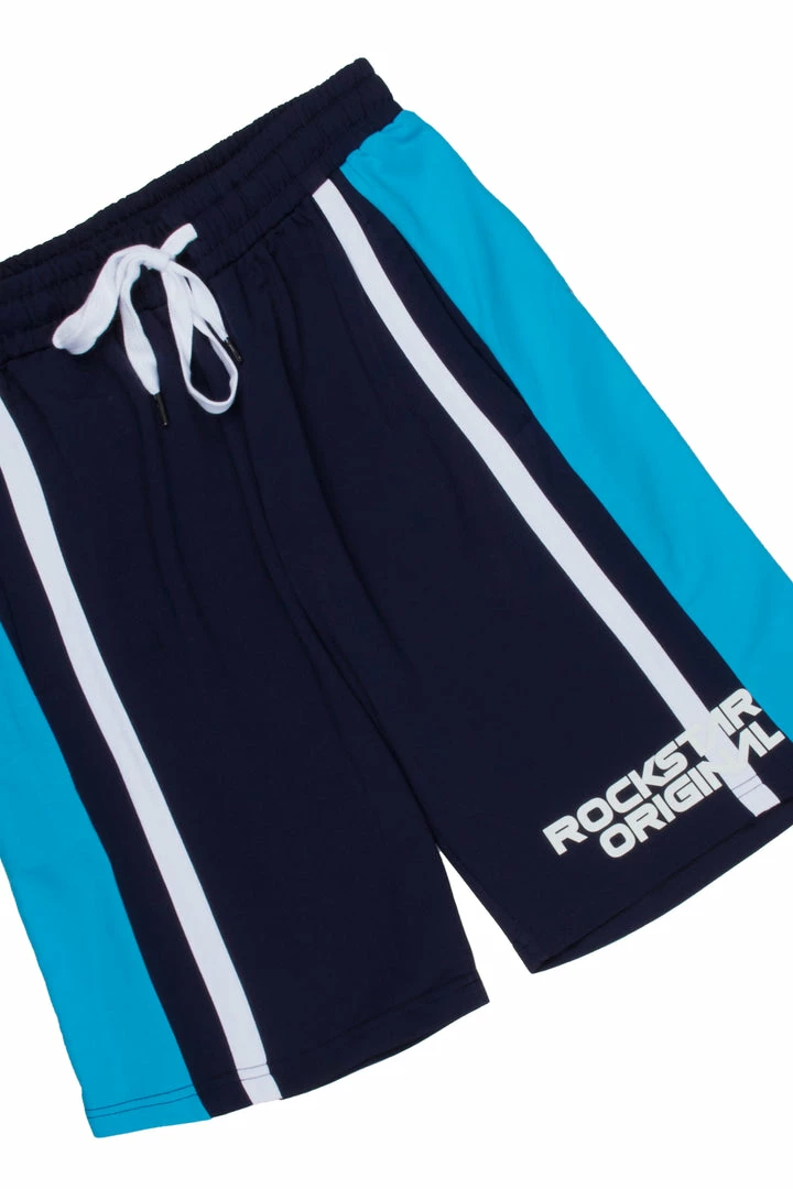 Rockstar Original Men’s shorts in navy. Featuring printed RSO logos with color block designing. Accenting an elastic drawstring waistband and pockets for a comfortable and convenient staple piece.