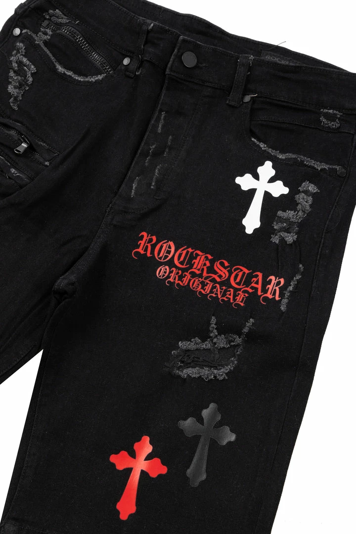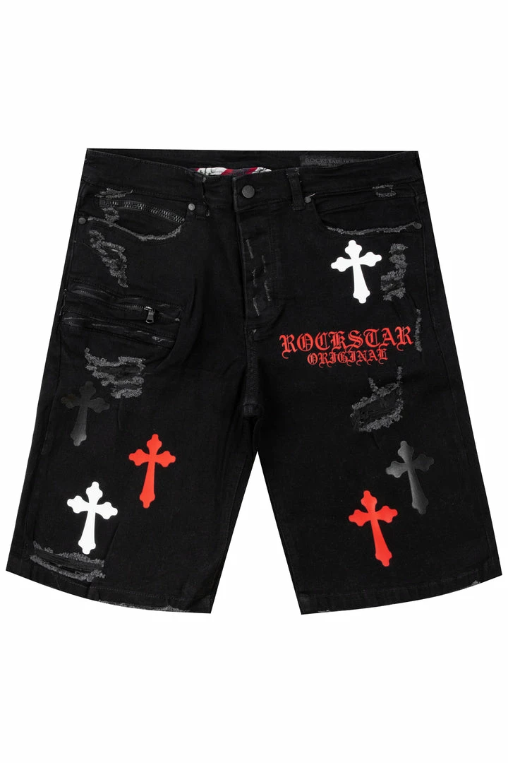 Rockstar Original men’s shorts featuring a RSO logo and graphic printed cross all throughout. Distressed details with a high quality zipper coin pocket.