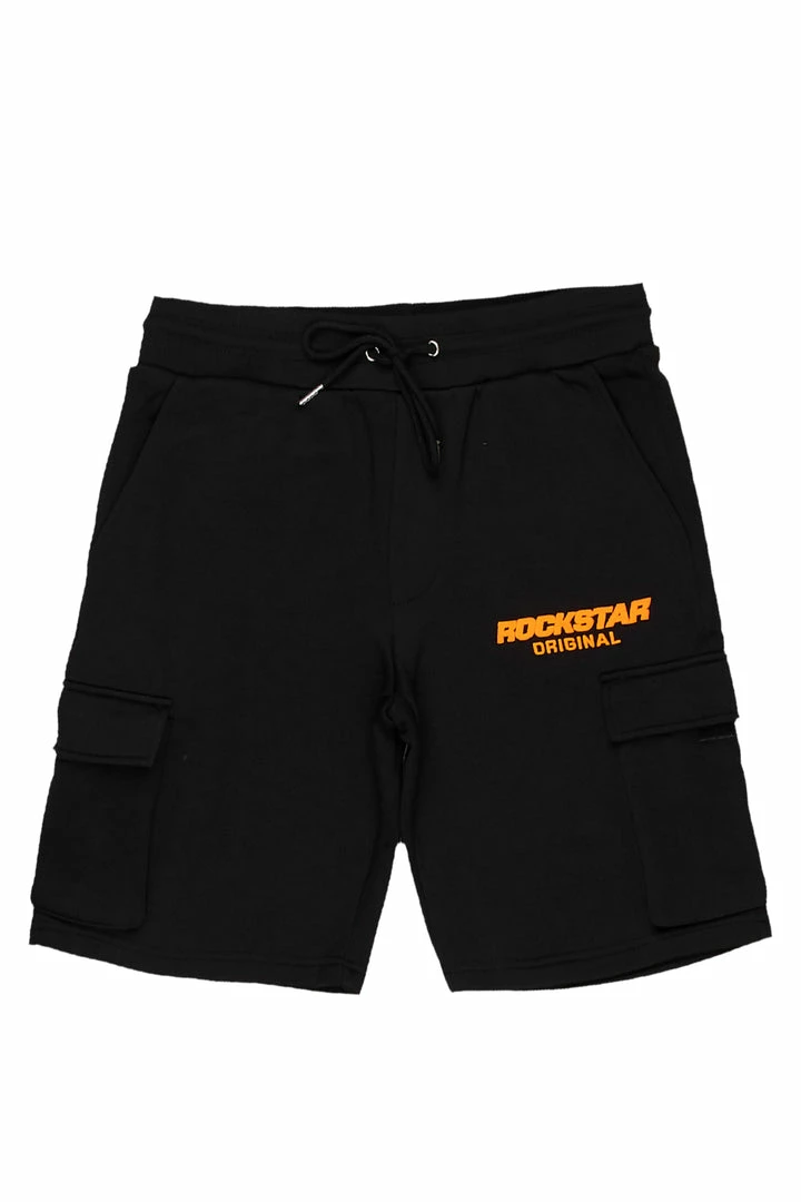 Rockstar Original Men’s shorts in black. Featuring a printed RSO logo. Accenting a cargo style design with a ribbed drawstring waistband and Velcro pockets.