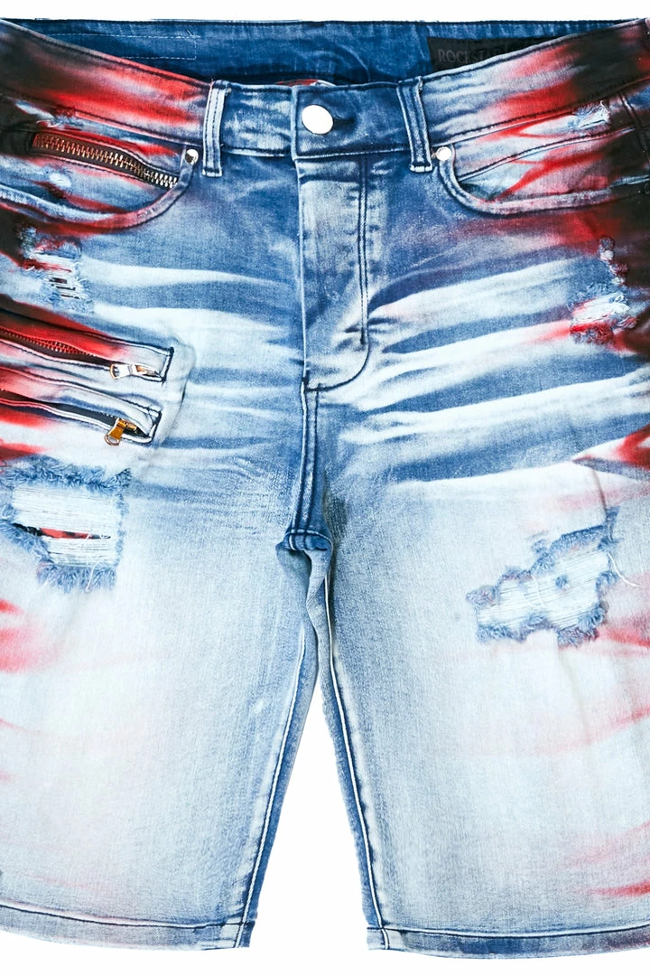 Rockstar Original Men’s denim shorts in light wash. Featuring custom paint splatter designing across pant sides with distressed details. Accenting a high-quality zipper coin pocket and a front button closure.