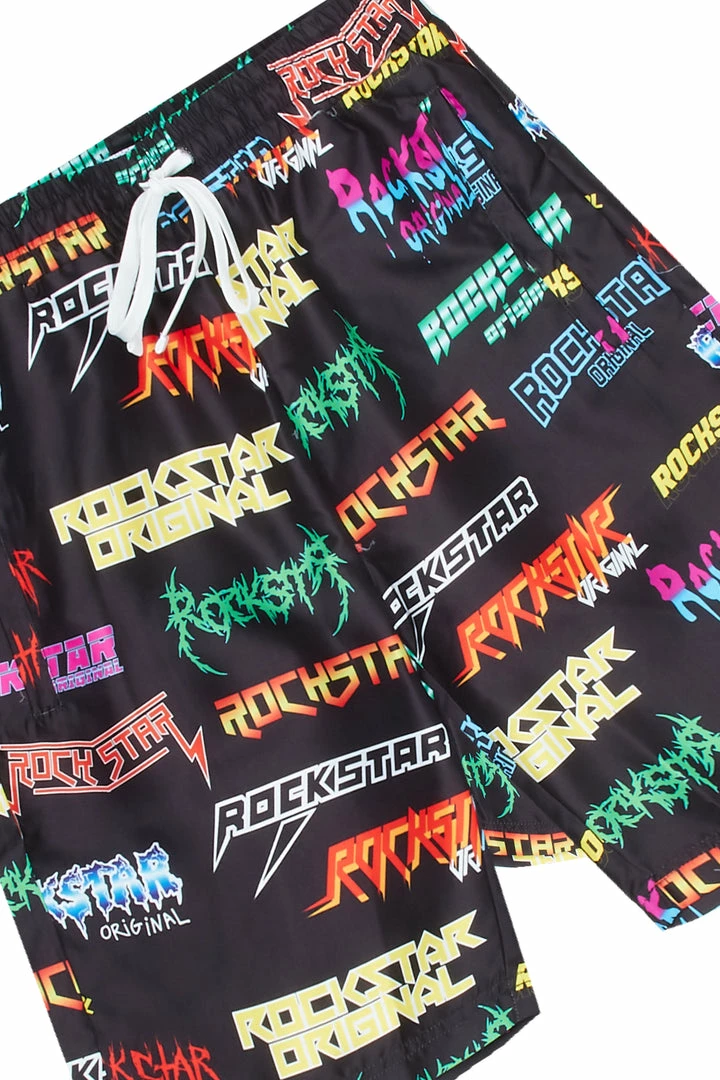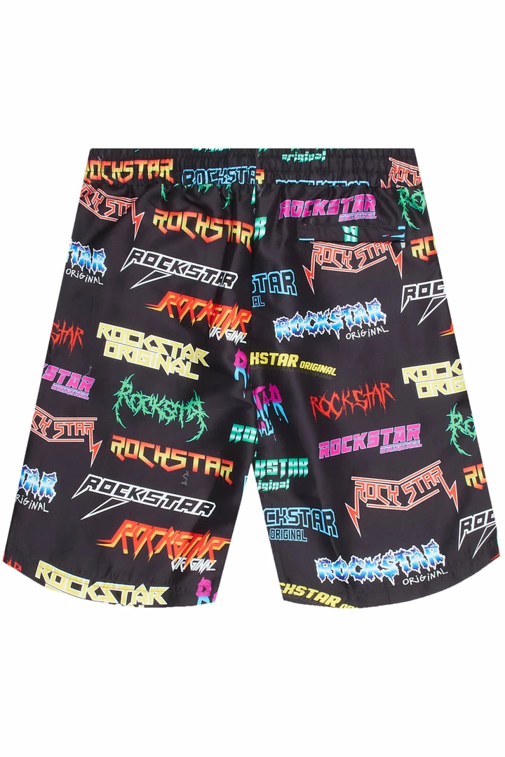 Rockstar Original Men’s flare swim short in black. Featuring multi color and multi font RSO logo pattern designing throughout. Accenting a drawstring waistband, side pockets with a posterior zipper pocket and inner mesh lining for a breathable fit.