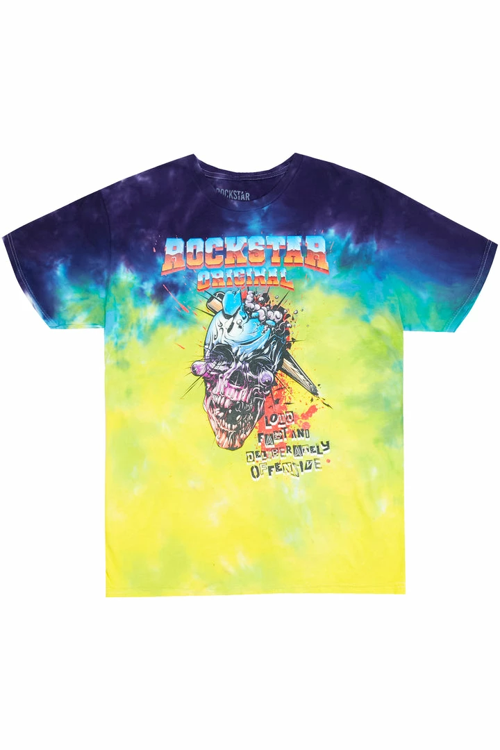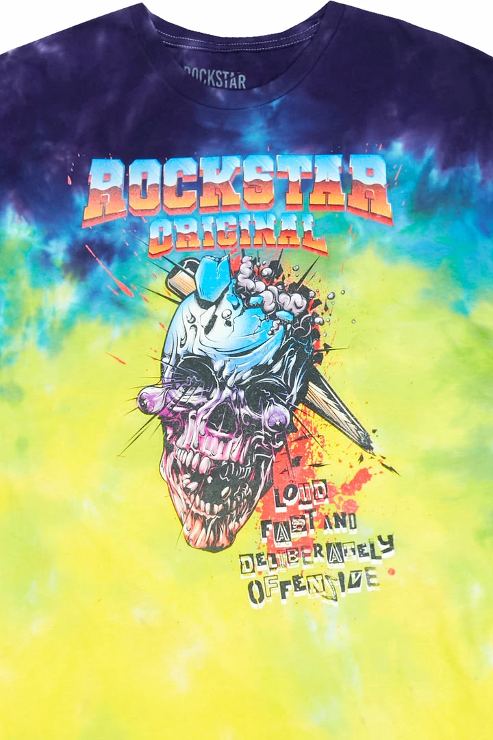 Rockstar Original men’s tee featuring a tie dye wash with a skull graphic print and RSO logo.