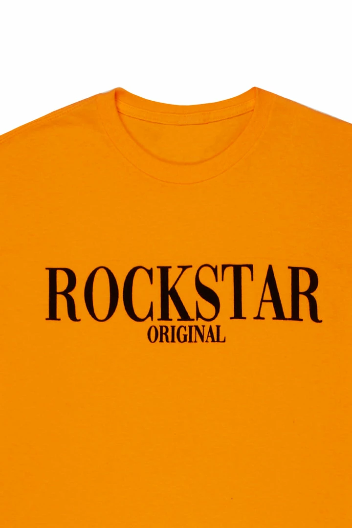 Rockstar Original Men’s tee in gold. Featuring a velvet flocking RSO logo, crew neckline and relaxed fit. This essential tee is made with premium cotton threading for all day comfort.
