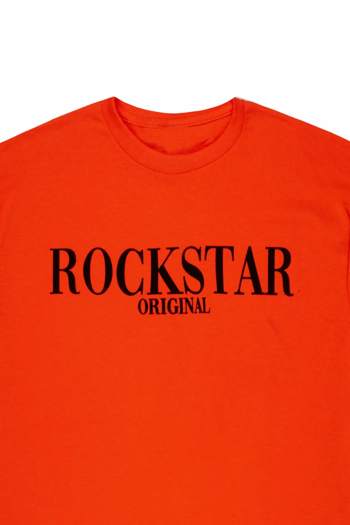 Rockstar Original Men’s tee inย orange. Featuring a velvet flocking RSO logo, crew necklineย and relaxed fit. This essential tee is made with premium cotton threading for all dayย comfort.