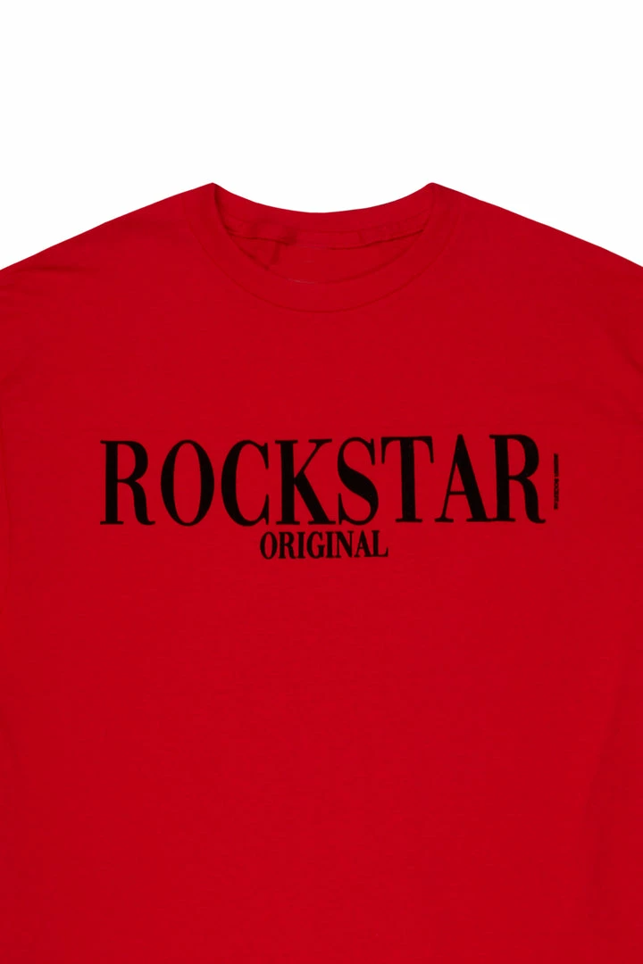 Rockstar Original Men’s tee in red. Featuring a velvet flocking RSO logo, crew neckline and relaxed fit. This essential tee is made with premium cotton threading for all day comfort.