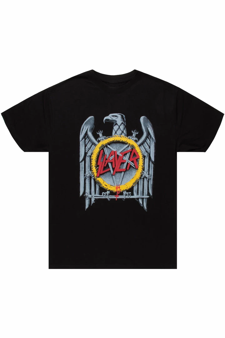 Rockstar Original Men’s tee in black. Featuring a Slayer logo with a classic eagle graphic to match. Accenting a relaxed fit with a crew neckline and premium cotton threading for maximum comfort and style.