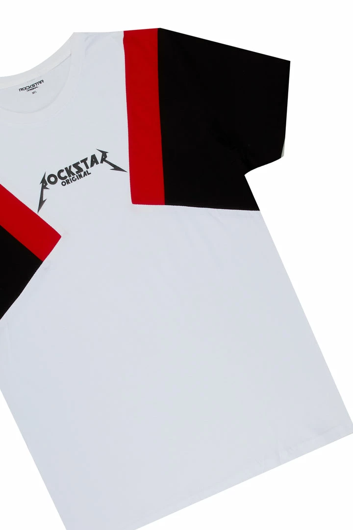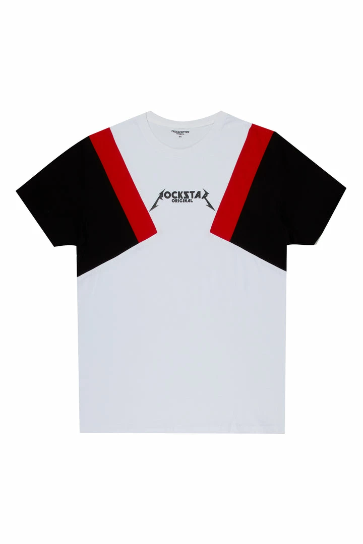 Rockstar Original Men’s tee in white. Featuring a printed RSO logo with a color block design. Accenting a crew neckline with short sleeves and a relaxed fit.