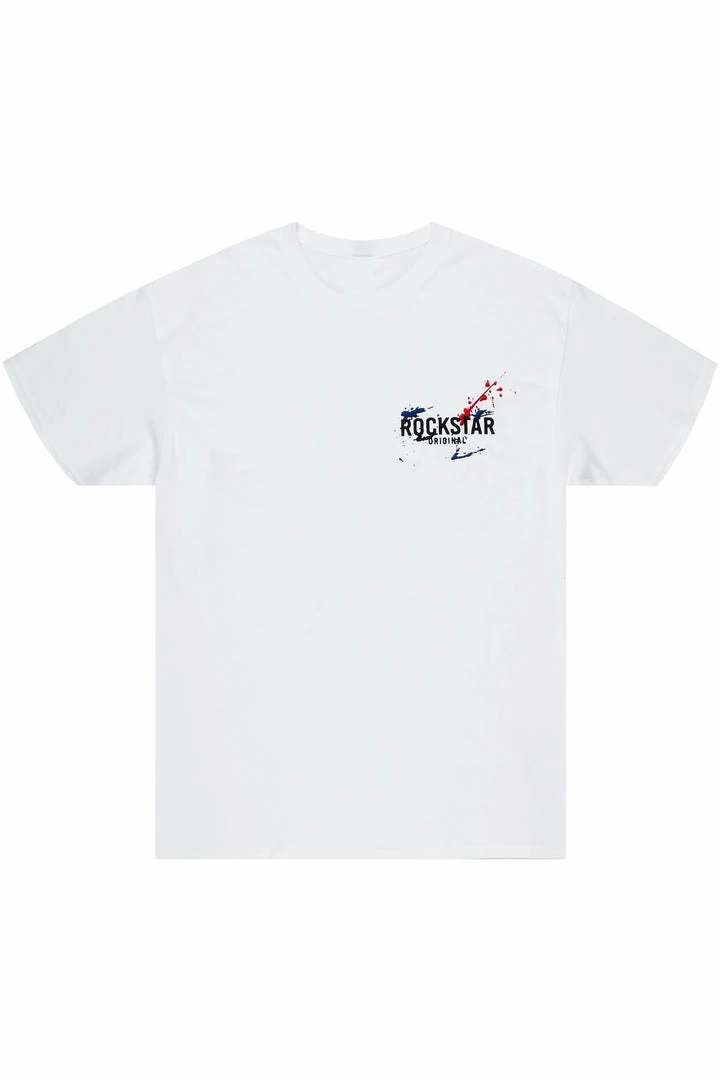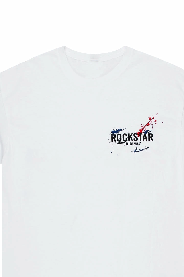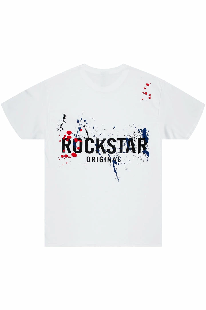 Rockstar Original Men’s tee in white. Featuring a printed RSO logo on the front and back with customer paint splatter designing. Accenting a crewย neckline andย premium cotton threading for a lightweight wear.