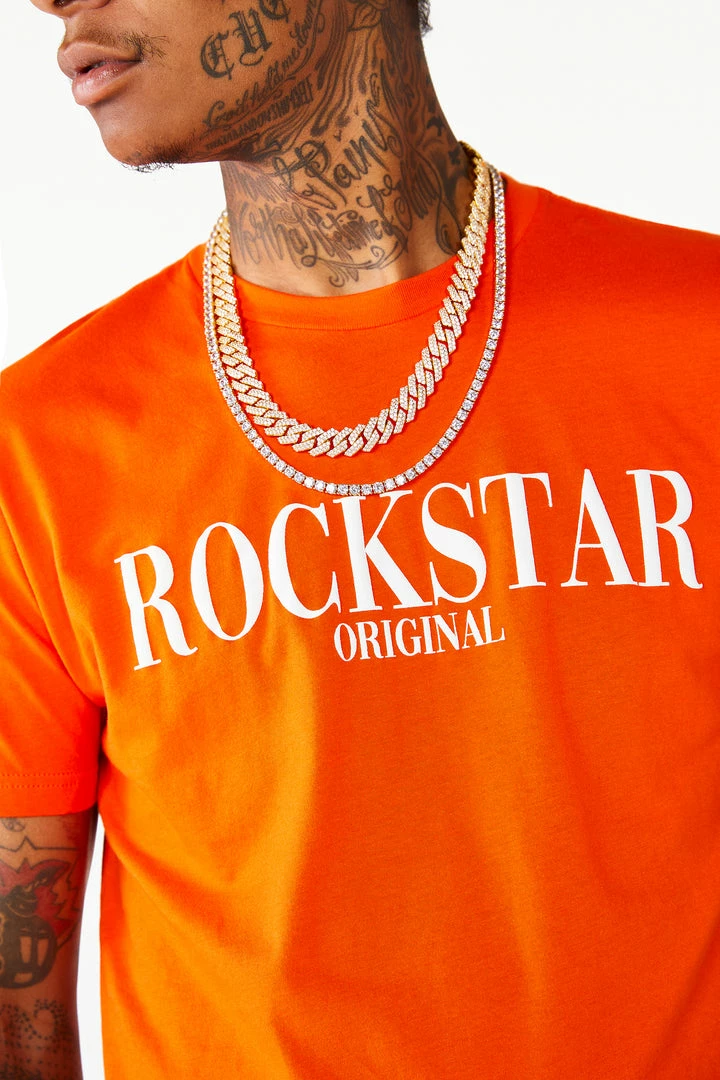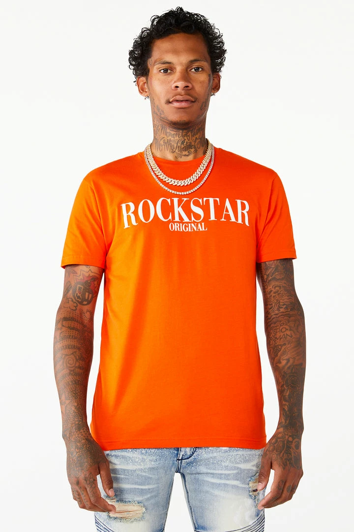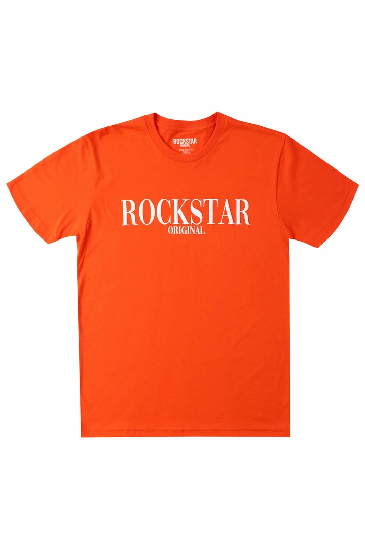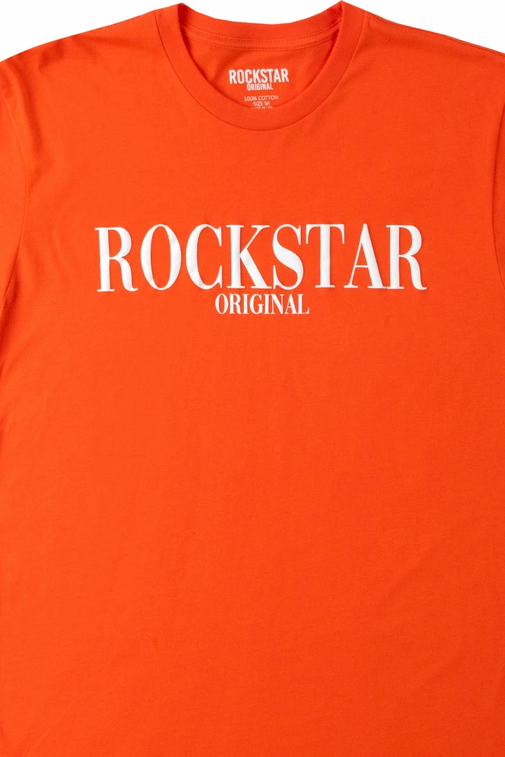 Rockstar Original Men’s tee in orange. Featuring a puff printed RSO logo, crew neckline and relaxed fit. This essential tee is made with premium cotton threading for all day comfort.