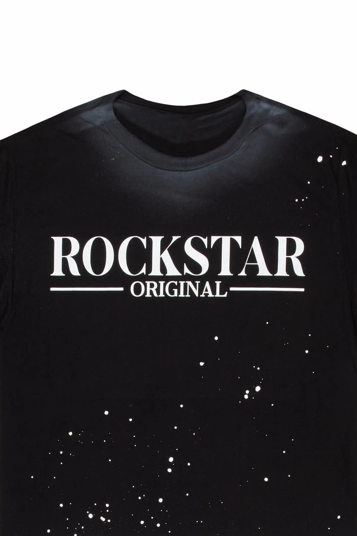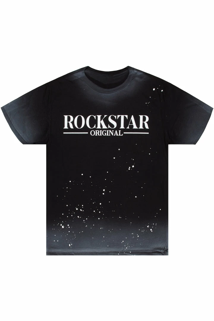 Rockstar Original Men’s tee in black. Featuring a printed RSO logo on the front with customer paint splatter designing for a vintage finish. Accenting a crewย neckline andย premium cotton threading for a lightweight wear.
