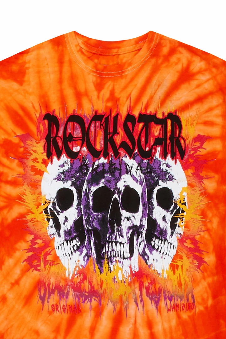 Rockstar Original Men’s tee in tie-dye orange. Featuring a RSO logo with a multi color skull graphic to match. Accenting a relaxed fit with a crew neckline and premium cotton threading for maximum comfort and style.