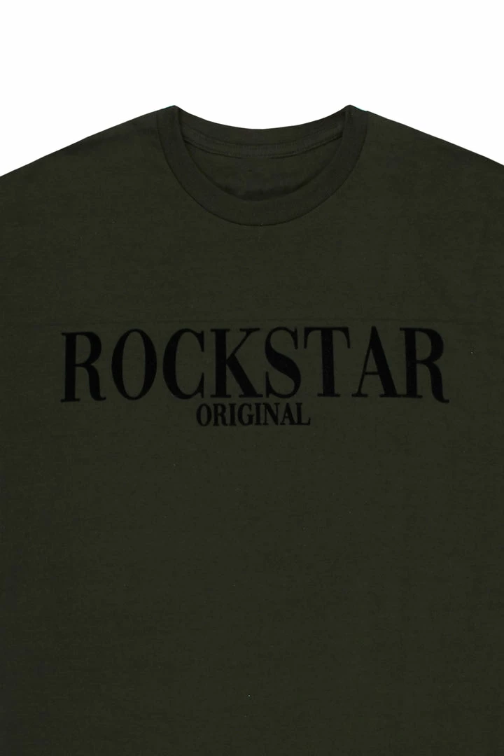 Rockstar Original Men’s tee in green. Featuring a velvet flocking RSO logo, crew neckline and relaxed fit. This essential tee is made with premium cotton threading for all day comfort.