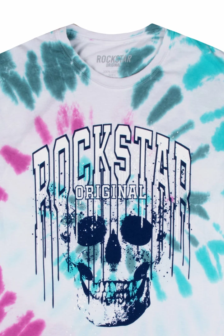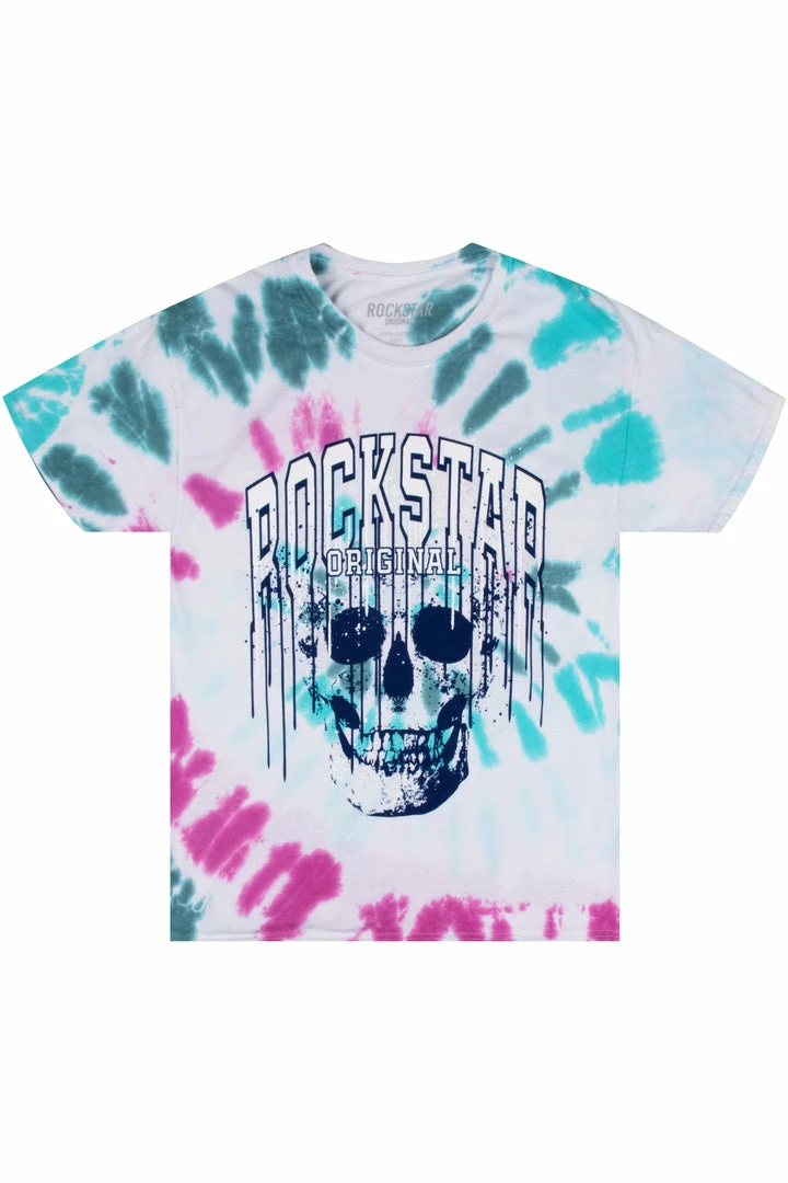 Rockstar Original Men’s tee in tie-dye blue. Featuring a RSO logo with a skull graphic to match. Accenting a relaxed fit with a crew neckline and premium cotton threading for maximum comfort and style.