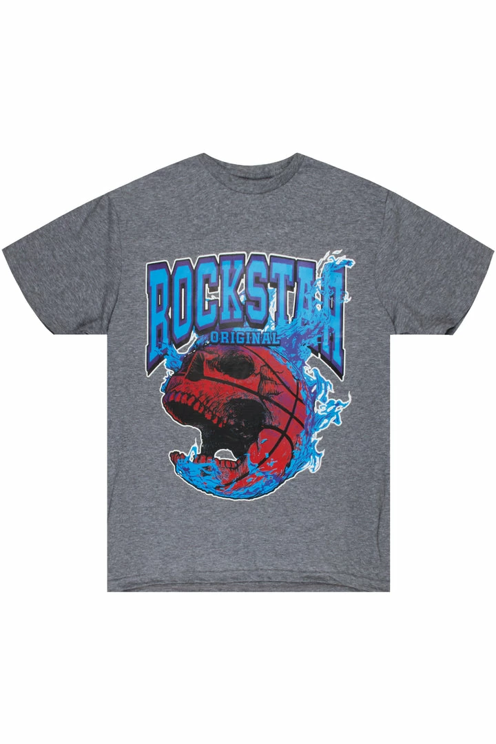 Rockstar Original Men’s tee in heather grey. Featuring a printed RSO logo with a multi color varsity skull graphic to match. This unique tee accents a crewneck line, lightweight wear and premium cotton threading for style and comfort.