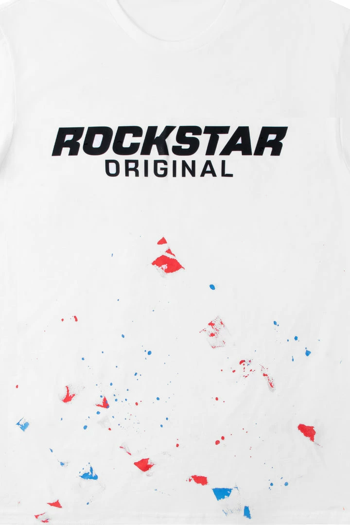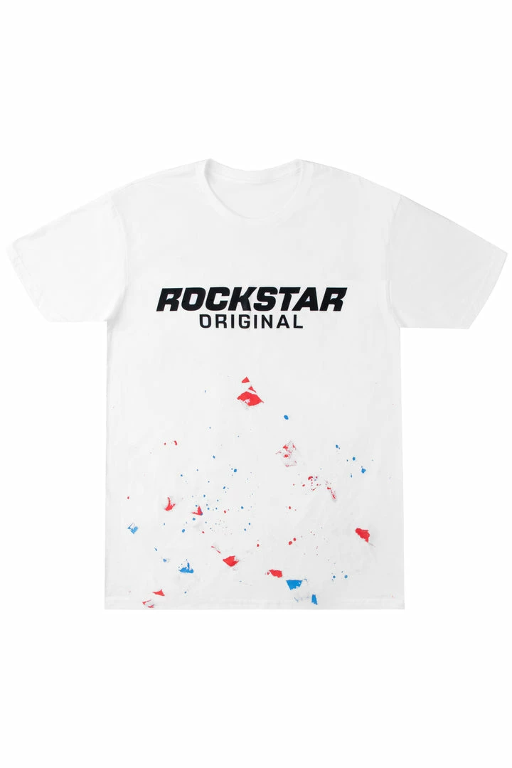 Rockstar Original men’s tee featuring a graphic printed RSO logo with light paint splatter details. Made with premium cotton.