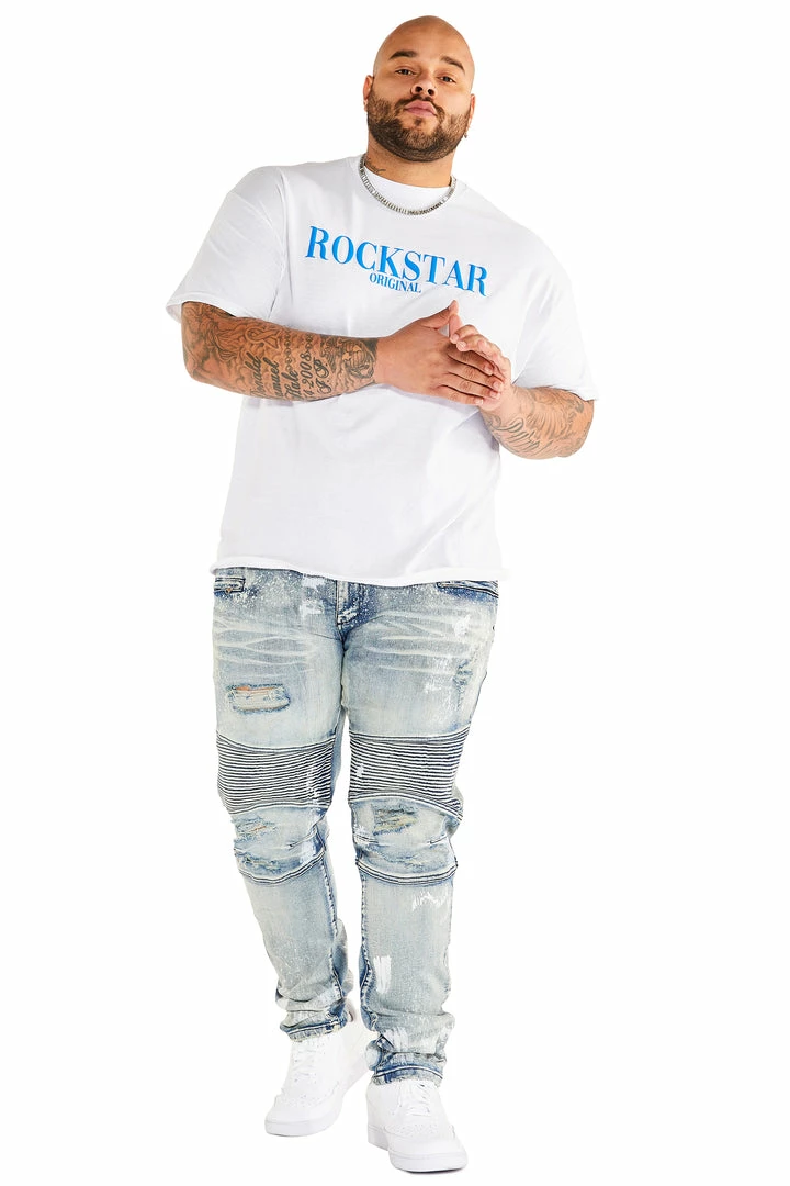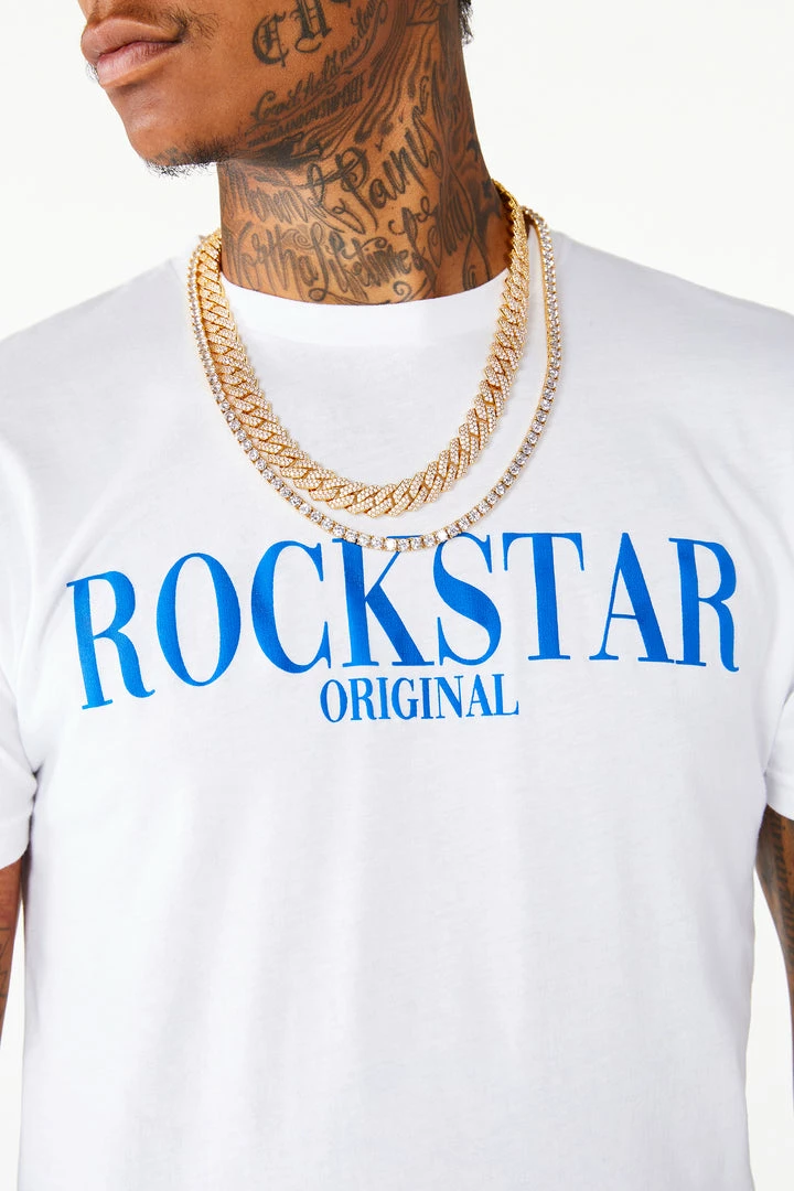 Rockstar Original Men’s tee in pure white. Featuring a puff printed RSO logo, crew neckline and relaxed fit. This essential tee is made with premium cotton threading for all day comfort.
