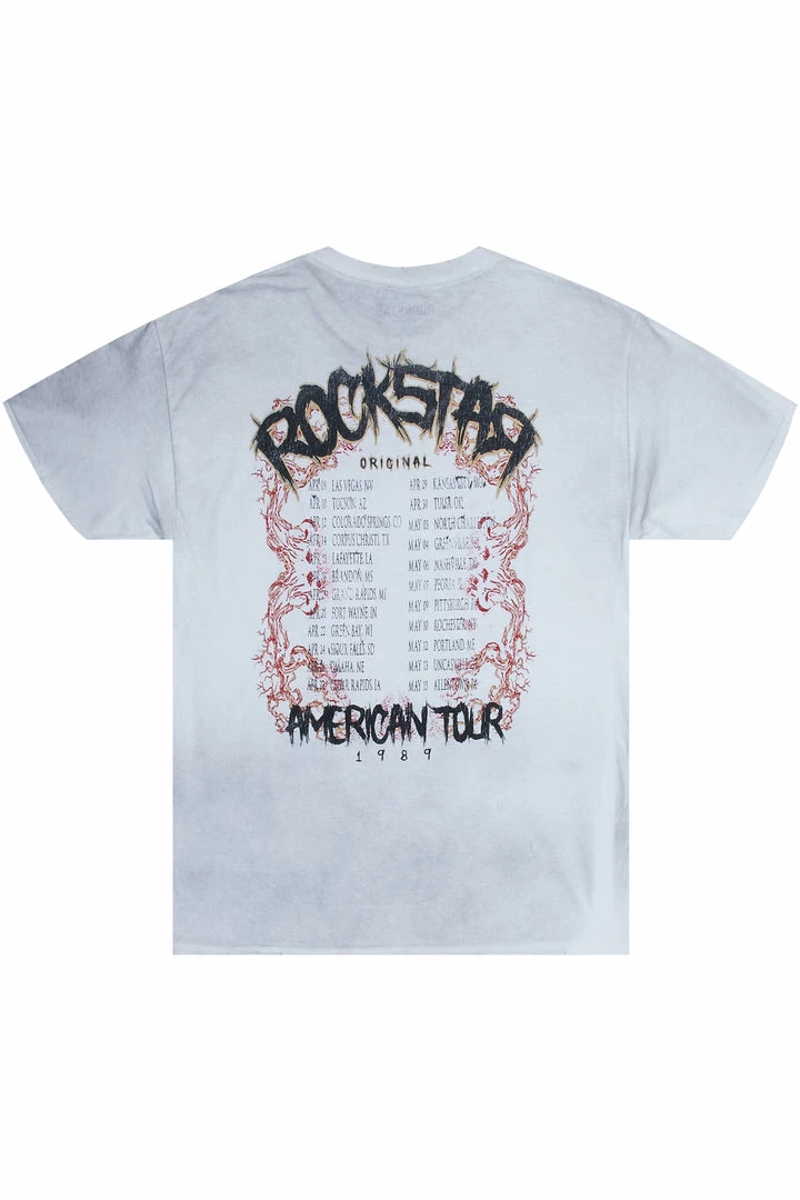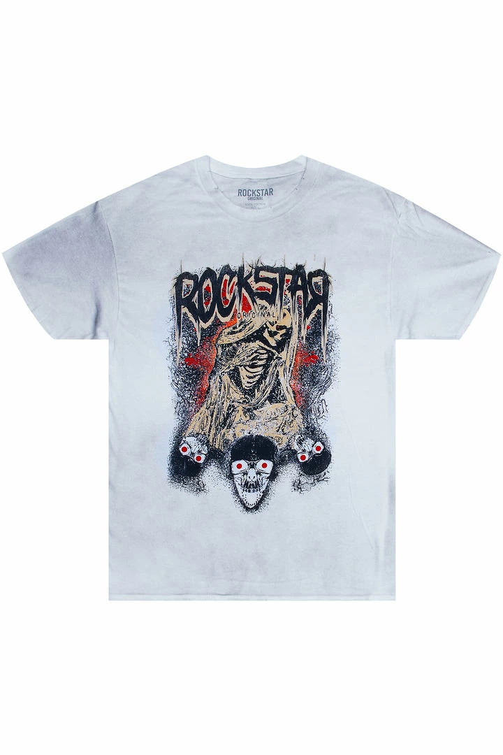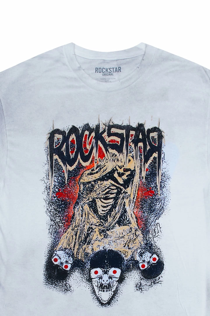 Rockstar Original Men’s vintage style tee in white. Featuring a printed RSO logo with custom graphics to match. Accenting a crew neckline with distressed details and a bleached finish. Designed with premium cotton threading for a comfortable classic tee.