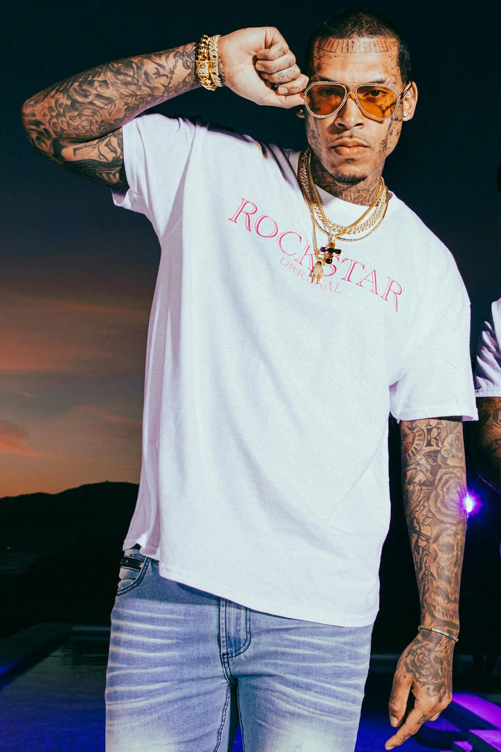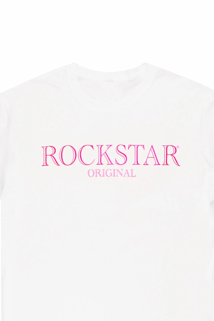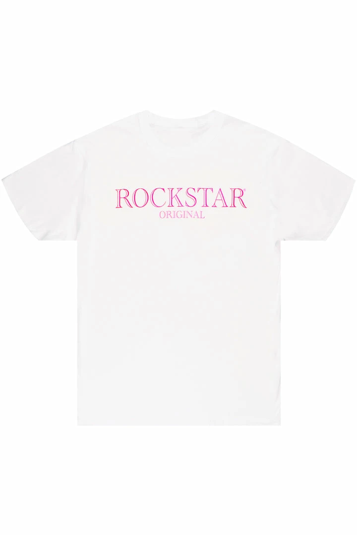 Rockstar Original Men’s tee in white. Featuring a printed RSO logo across the chest. This unique tee accents a crewneck line, lightweight wear and premium cotton threading for style and comfort.