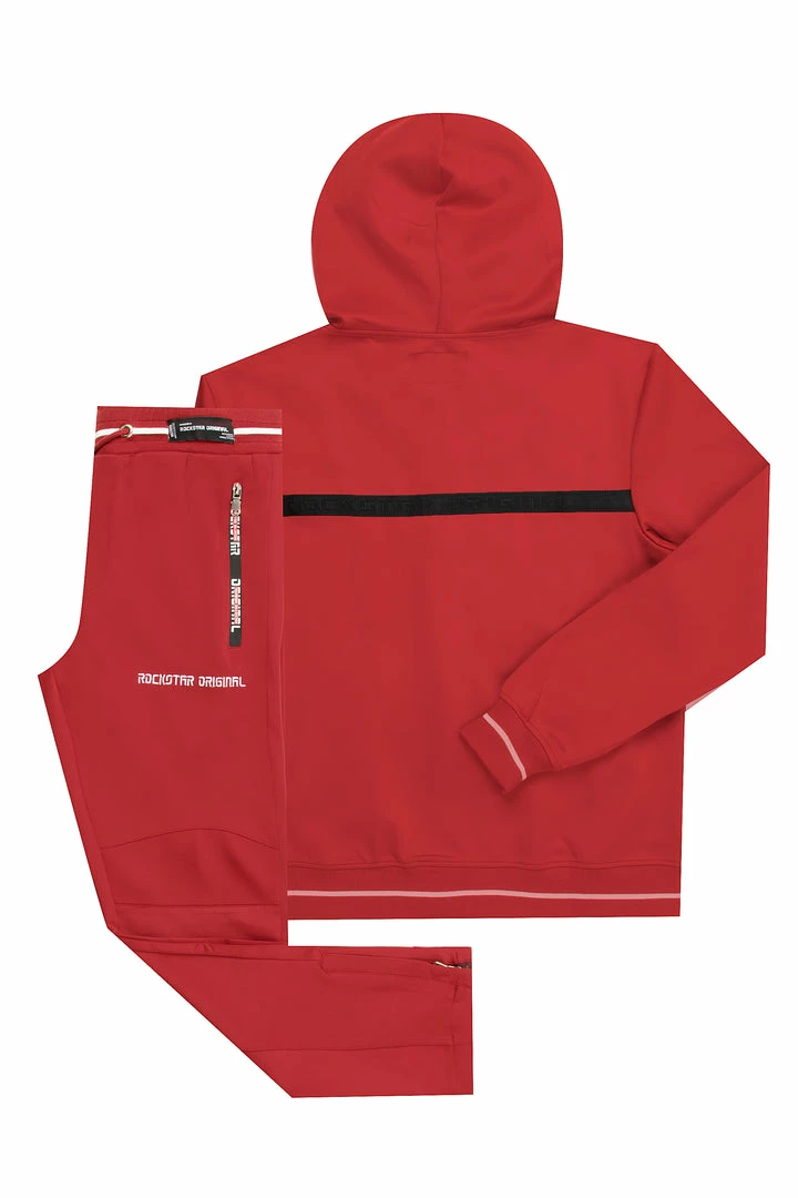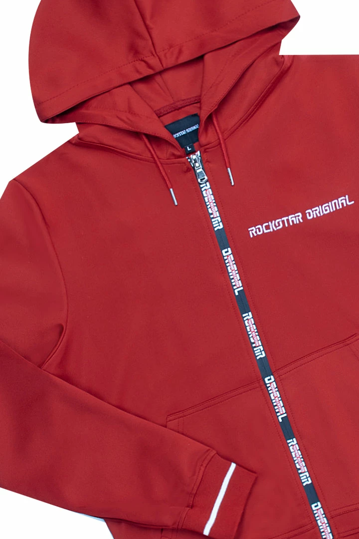 Rockstar Original Men’s two-piece tracksuit set in bold burgundy. Track jacket and pant features subtle RSO designing throughout. Accenting high quality zipper closure on the jacket and a drawstring hood and a drawstring waistband with zipper pockets on the pant for maximum versatility. This set is the perfect staple piece for leisure and luxury.