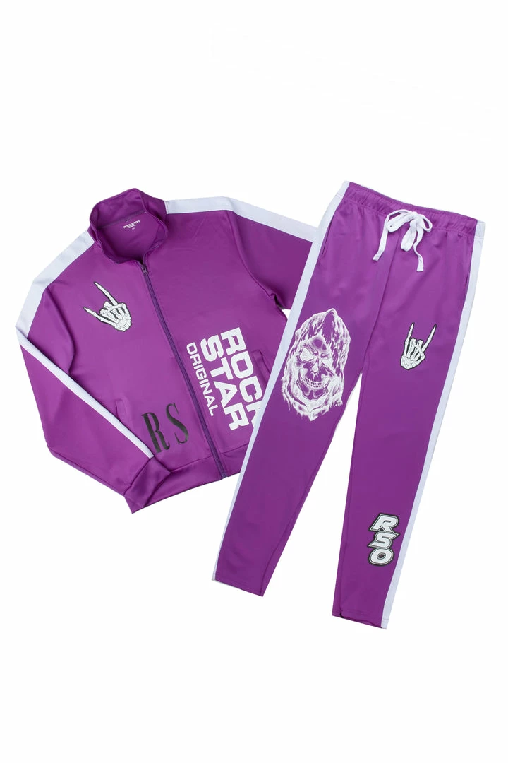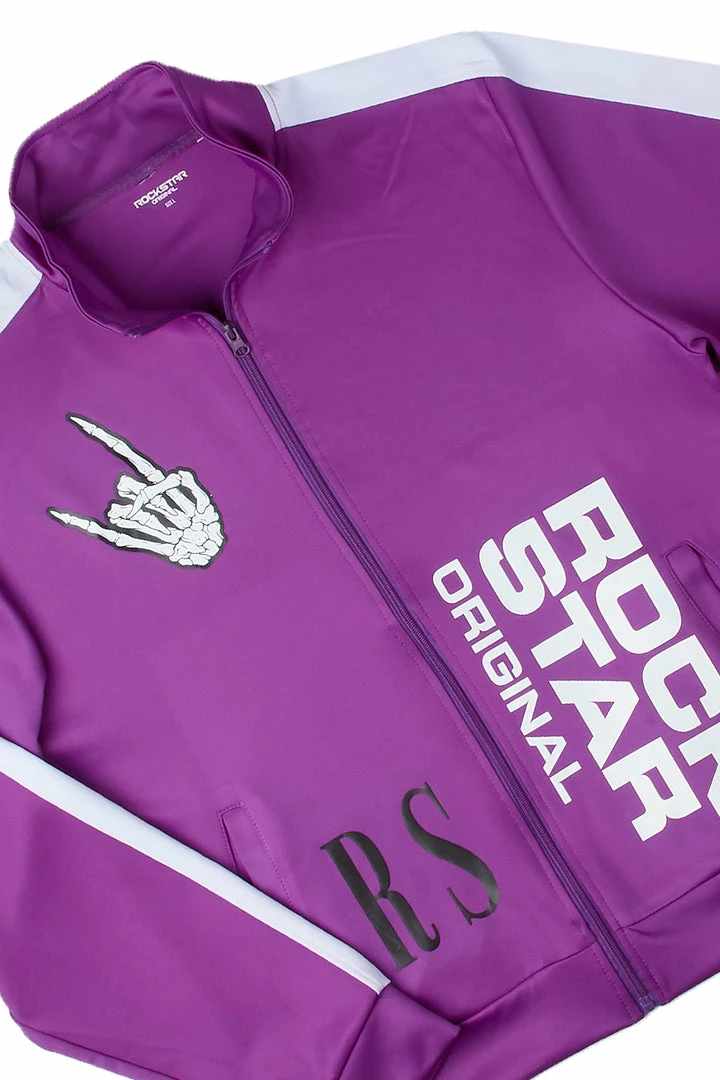 Rockstar Original Men’s two-piece tracksuit set in purple. Featuring printed RSO logosย and graphics with a racer stripe finish throughout. Designed as a lightweight wear with a high quality front zip stand-up collar closureย and side pockets while bottoms accent aย drawstring waistband, pockets throughout andย ankle zipperย inseams. Stay fresh with this effortless ‘fit.