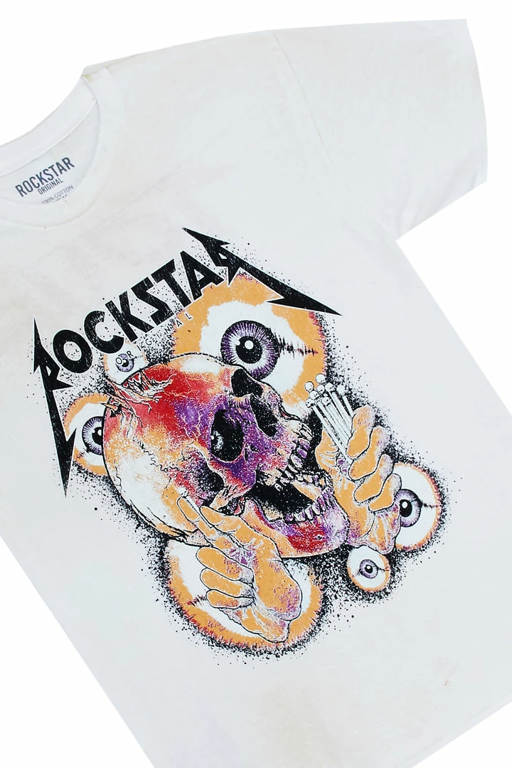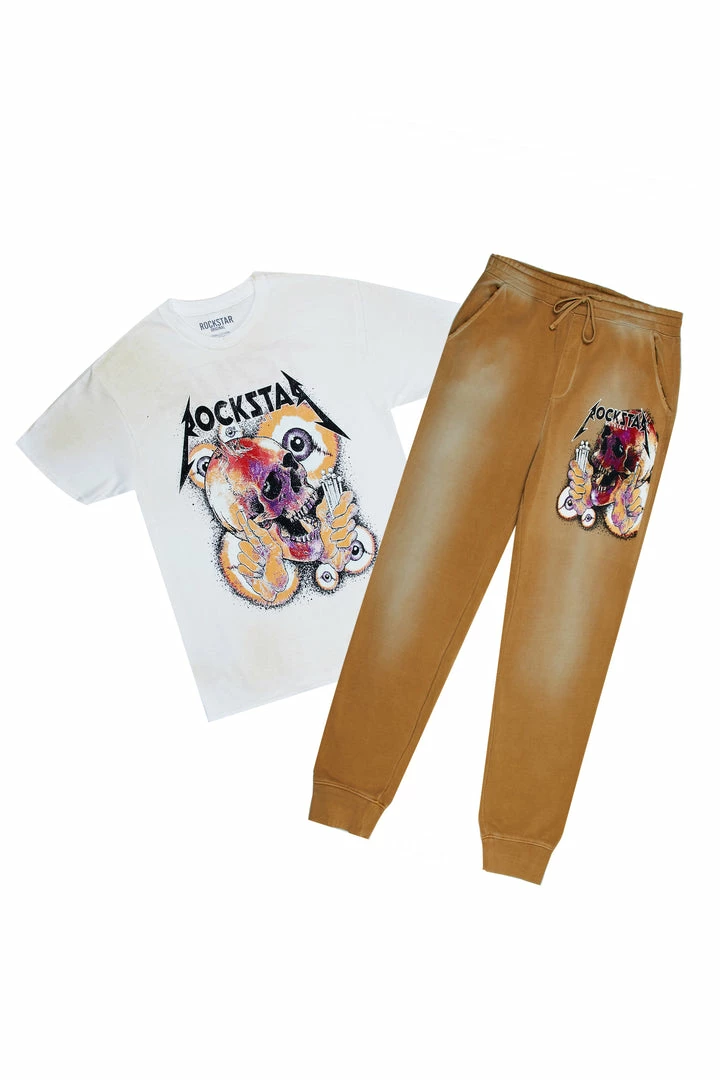 Rockstar Original Men’s vintage style jogger set in beige. Featuring printed RSO logos and multi color skull graphics to match on the top and bottom. Top accents a crew neckline with distressed details and a bleached finish while bottoms accent a drawstring waistband with side pockets and rib knit cuffs. Designed with premium cotton threading for all day comfort.