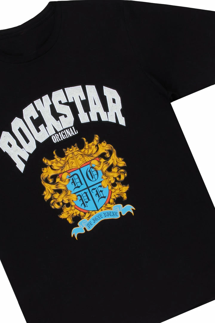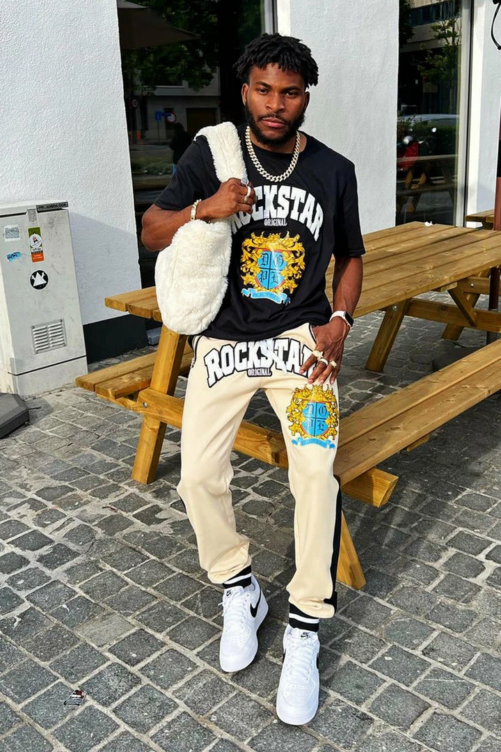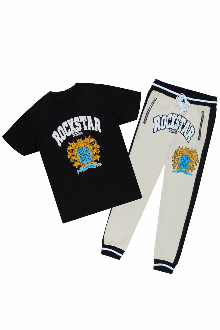 Rockstar Original Men’s two-piece jogger set in black. Featuring embroidered RSO logos on the top and bottoms with multi color varsity graphics to match. Top accents a crewneck line, lightweight wear and premium cotton threading while bottoms accent a ribbed drawstring waistband with a racer stripe design, multiple pockets and ribbed cuffs.