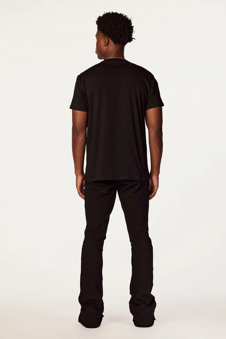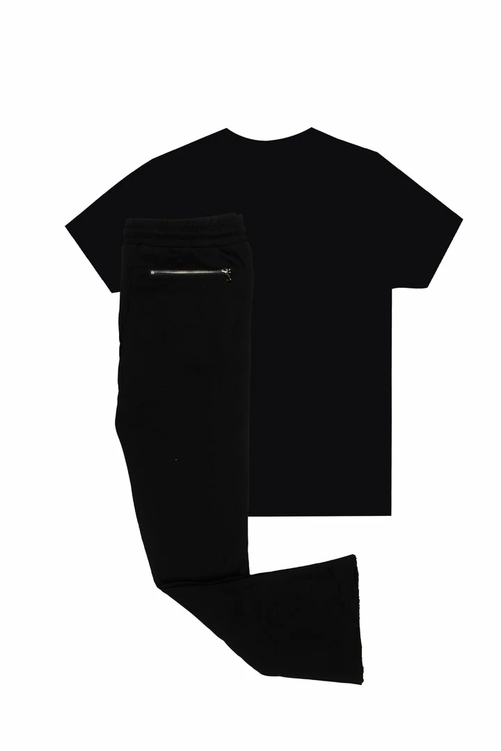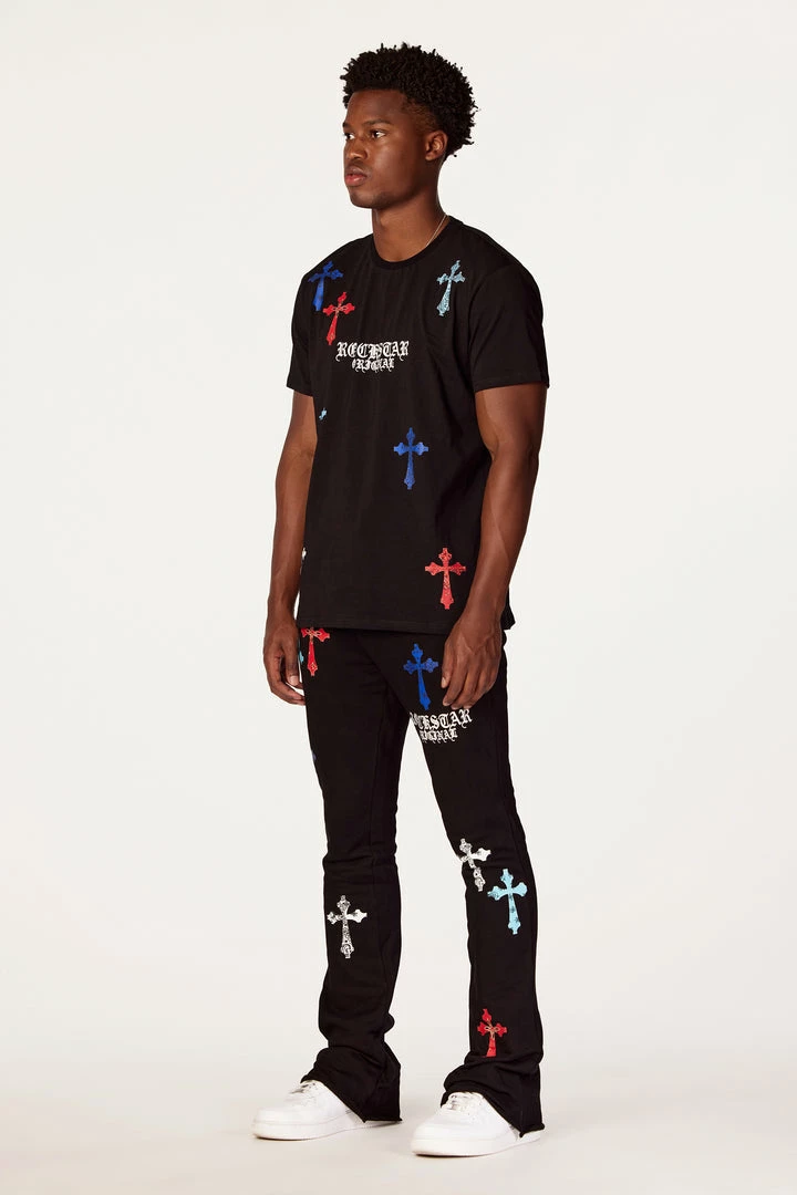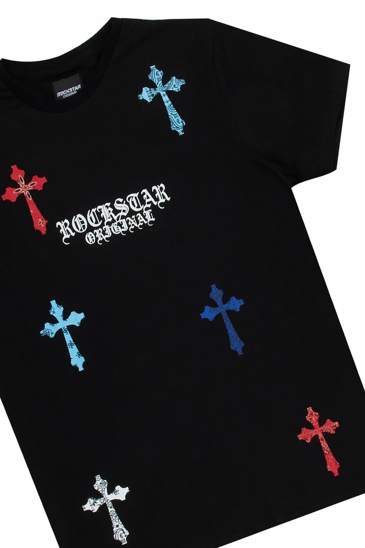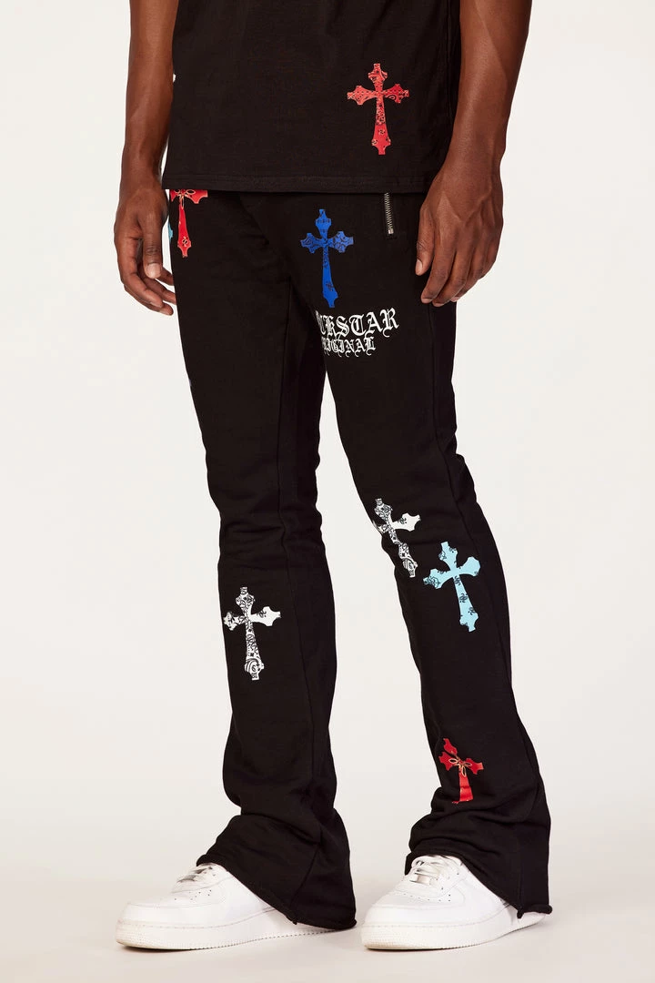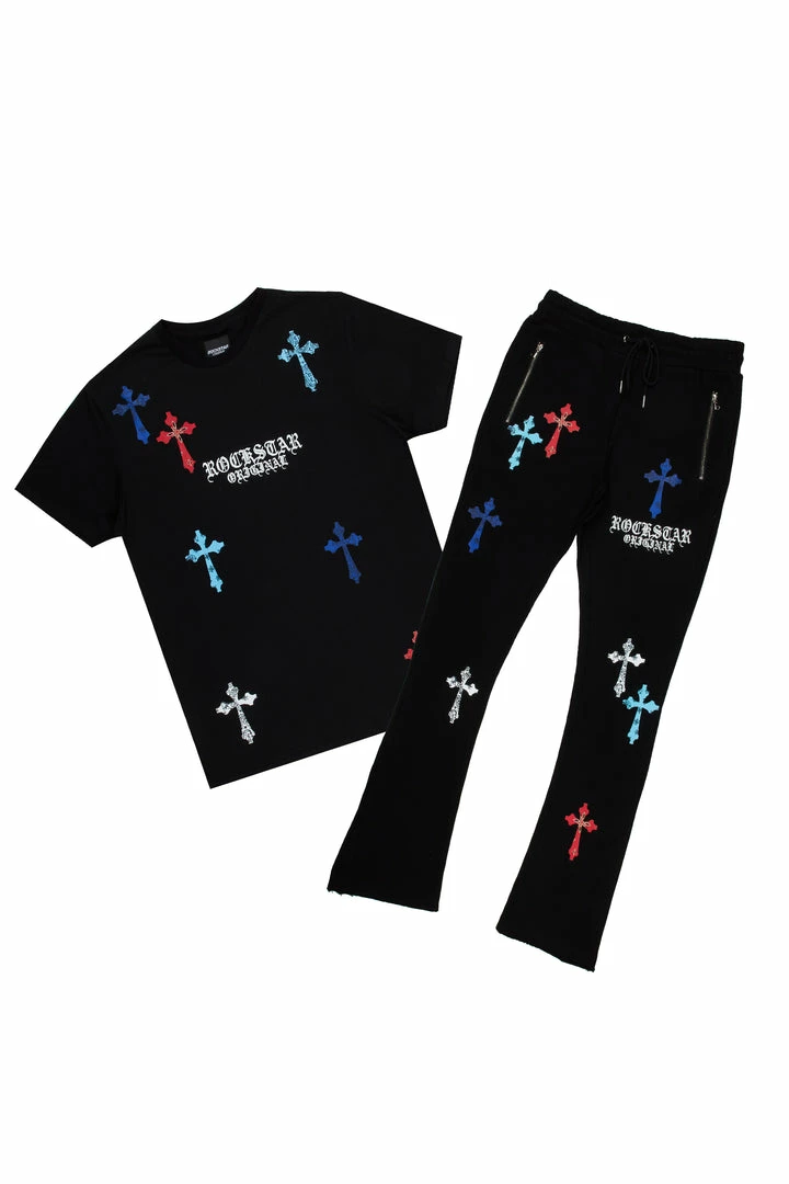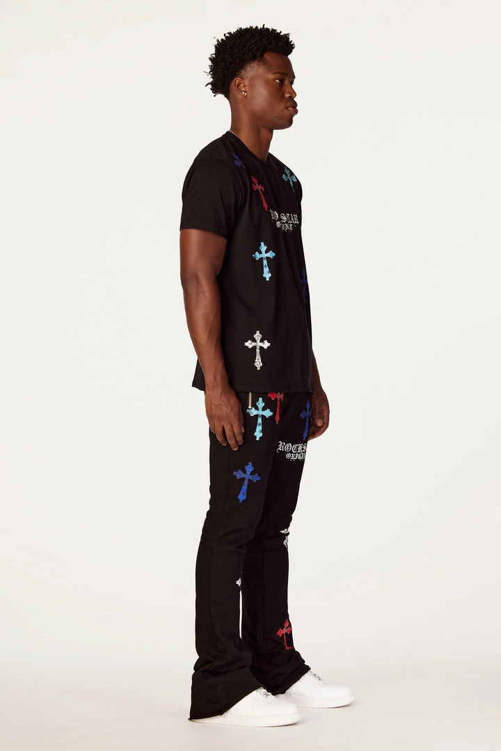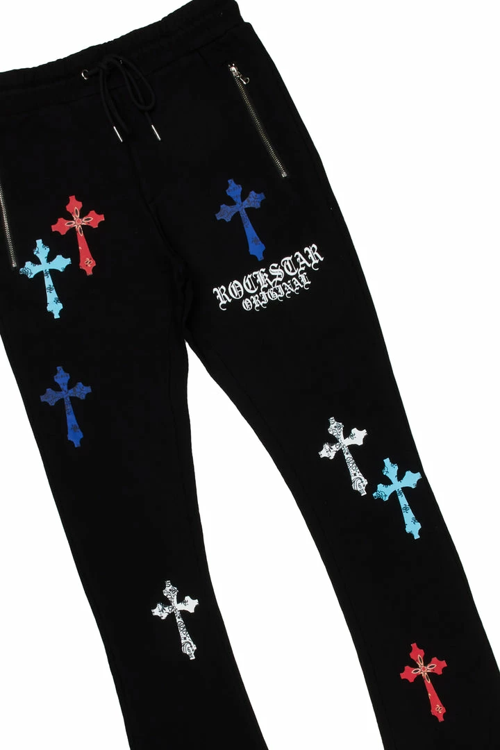 Rockstar Original Men’s two-piece tracksuit set in black. Featuring printed RSO logos with multi color paisley cross graphics throughout. Top accents a crewneck collar and relaxed fit while bottoms accent an elastic drawstring waistband, side pockets and flare hems.