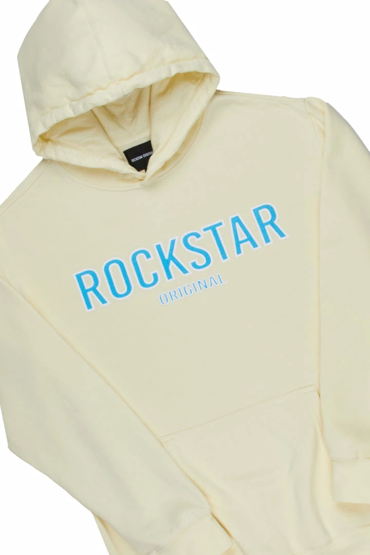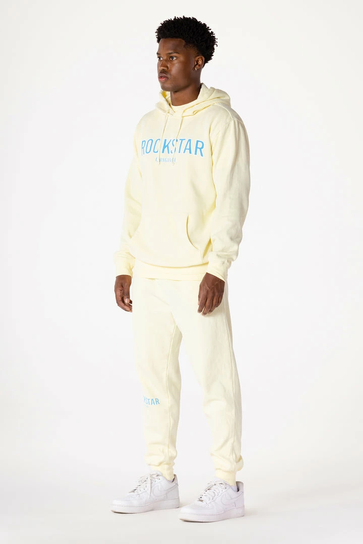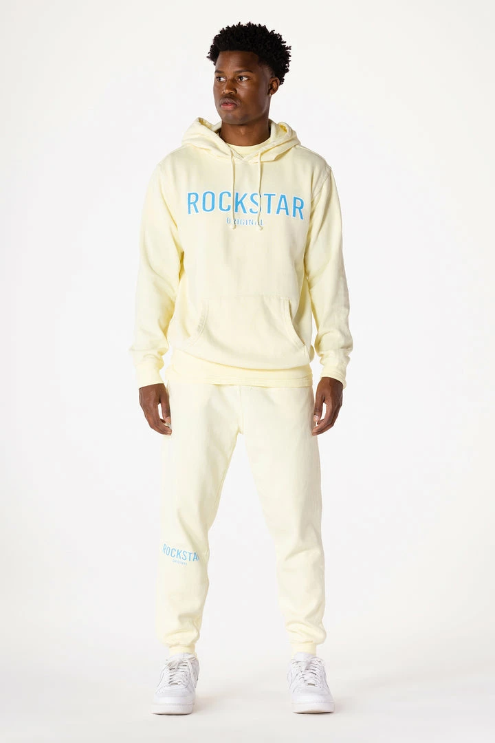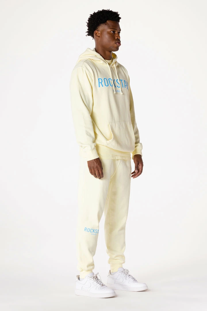 Rockstar Original Men’s two-piece essential sweat pant set inย yellow. Featuring cleanย RSO logosย on the top and bottom. Top accents aย drawstring hoodย and ribbed cuffs and hemline while bottoms accent a drawstring waistband, side pockets and ribbed cuffs. Designed with luxurious cotton for a super soft internal finish.