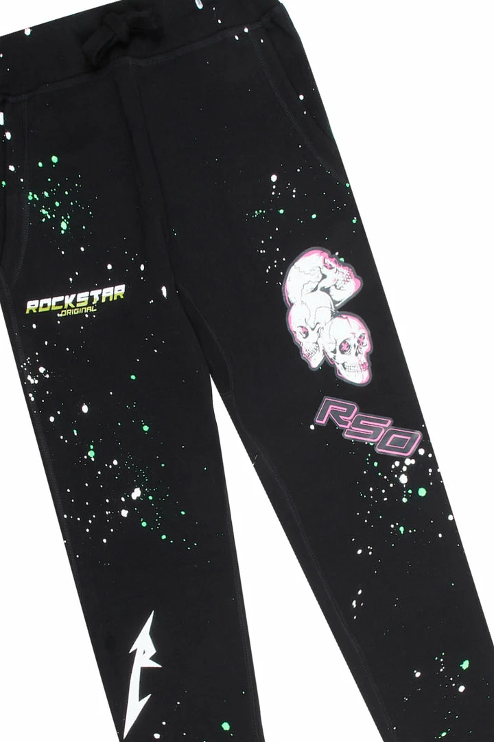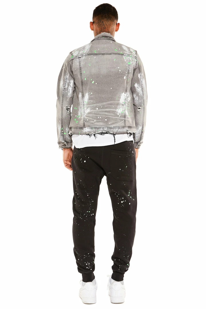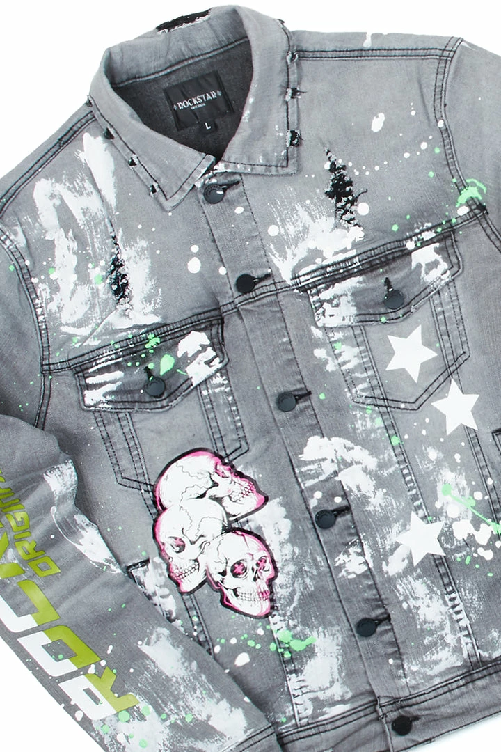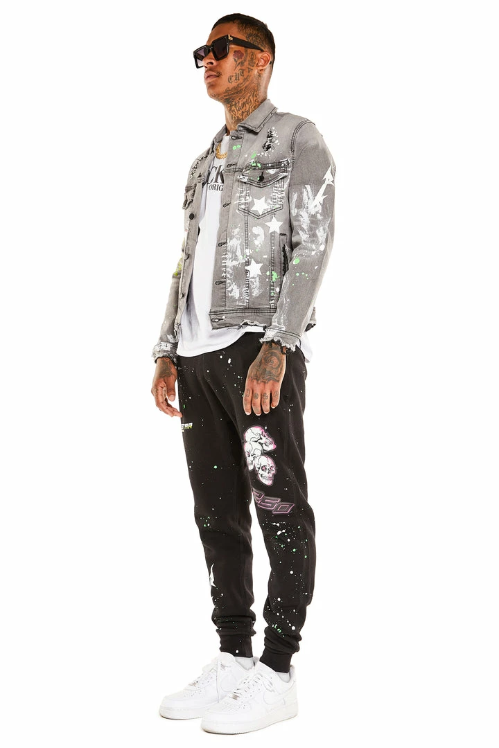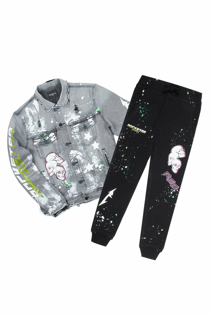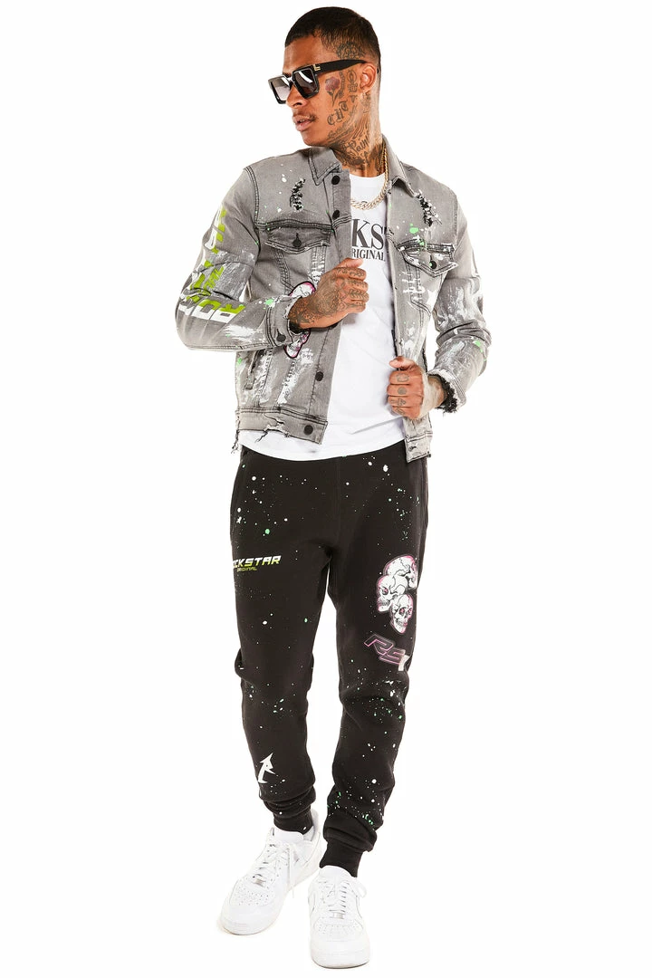 Rockstar Original Men’s denim jacket tracksuit set. Featuring grey wash denim jacket and black track pant with custom splatter paint and printed graphic designing throughout. Accenting a drawstring waistband on the pant and multi pockets throughout the jacket with a button placket closure. The dopest mix of streetwear athleisure in the game is made with premium cotton for all day comfort.