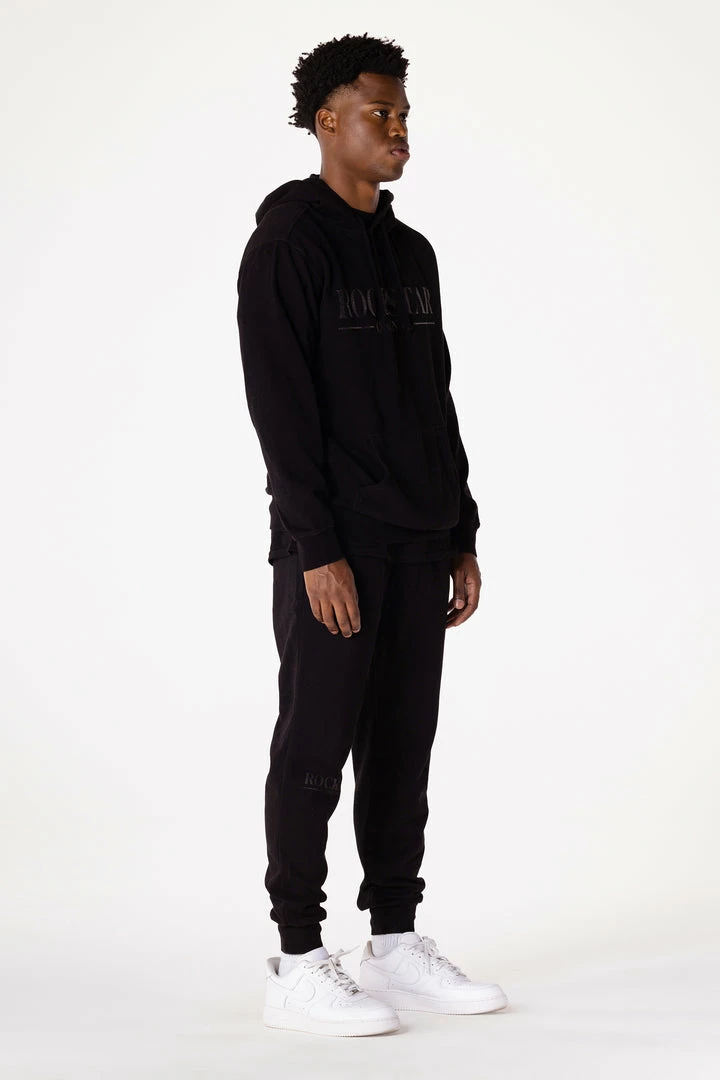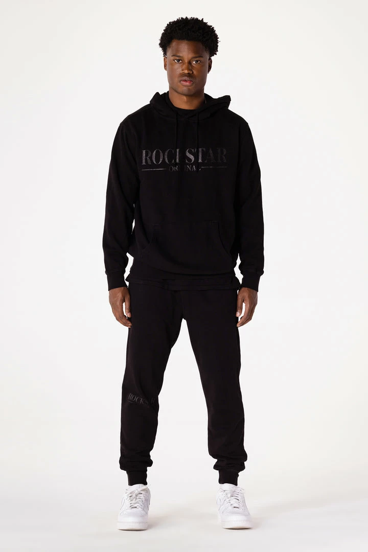 Rockstar Original Men’s two-piece essential sweat pant set in black. Featuring clean RSO logos on the top and bottom. Top accents a drawstring hood and ribbed cuffs and hemline while bottoms accent a drawstring waistband, side pockets and ribbed cuffs. Designed with luxurious cotton for a super soft internal finish.