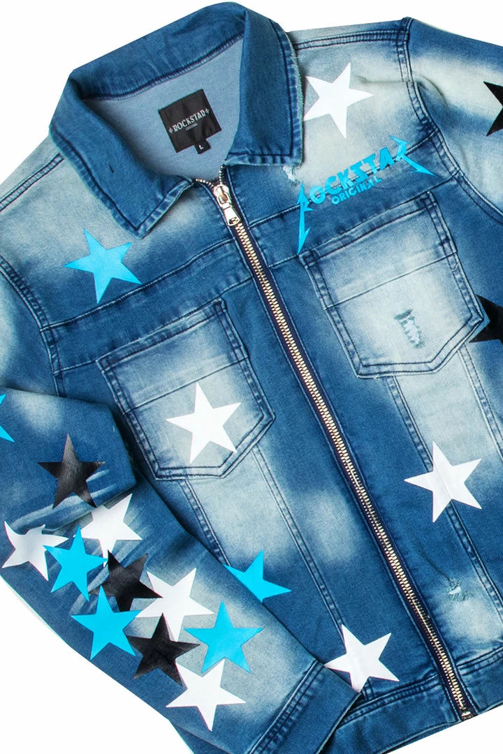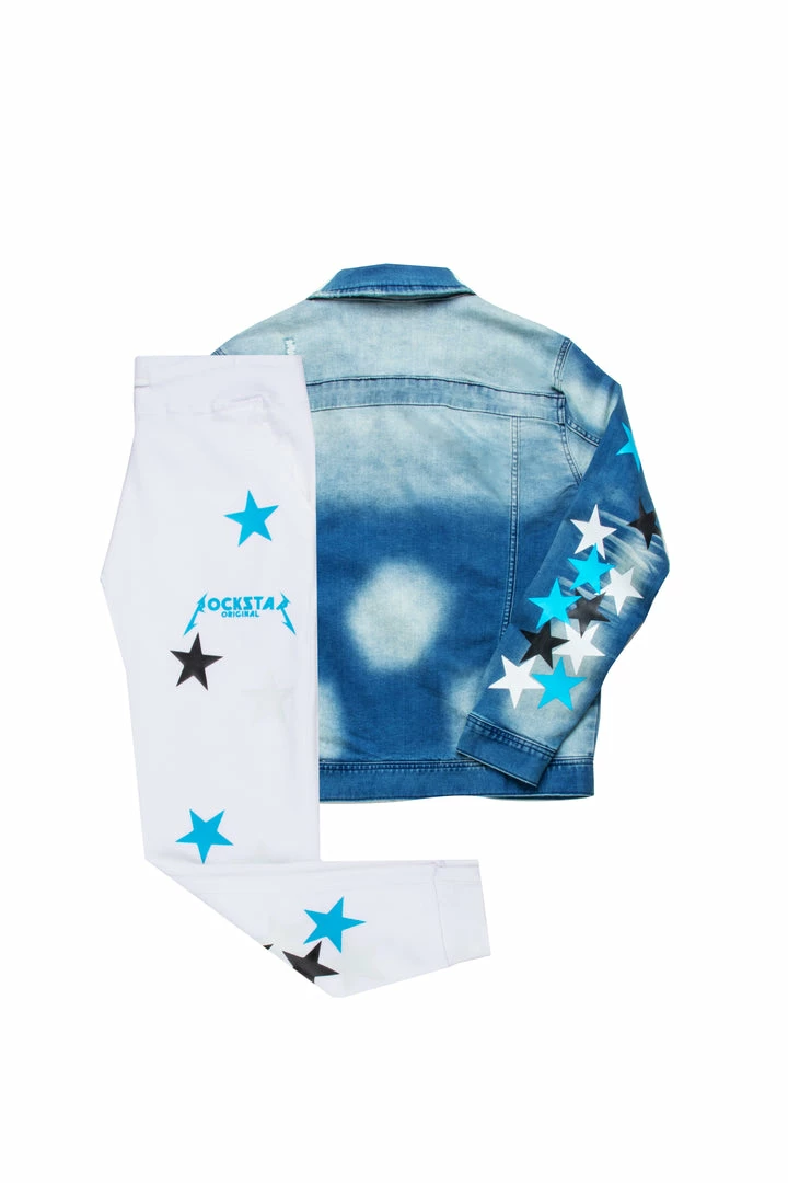 Rockstar Original Men’s denim jacket tracksuit set. Featuring light wash denim and versatile track pants with bold star designing throughout. Accenting a drawstring waistband on the pant and multi pockets throughout the jacket. Made to move with you and for you — the Rockstar way.