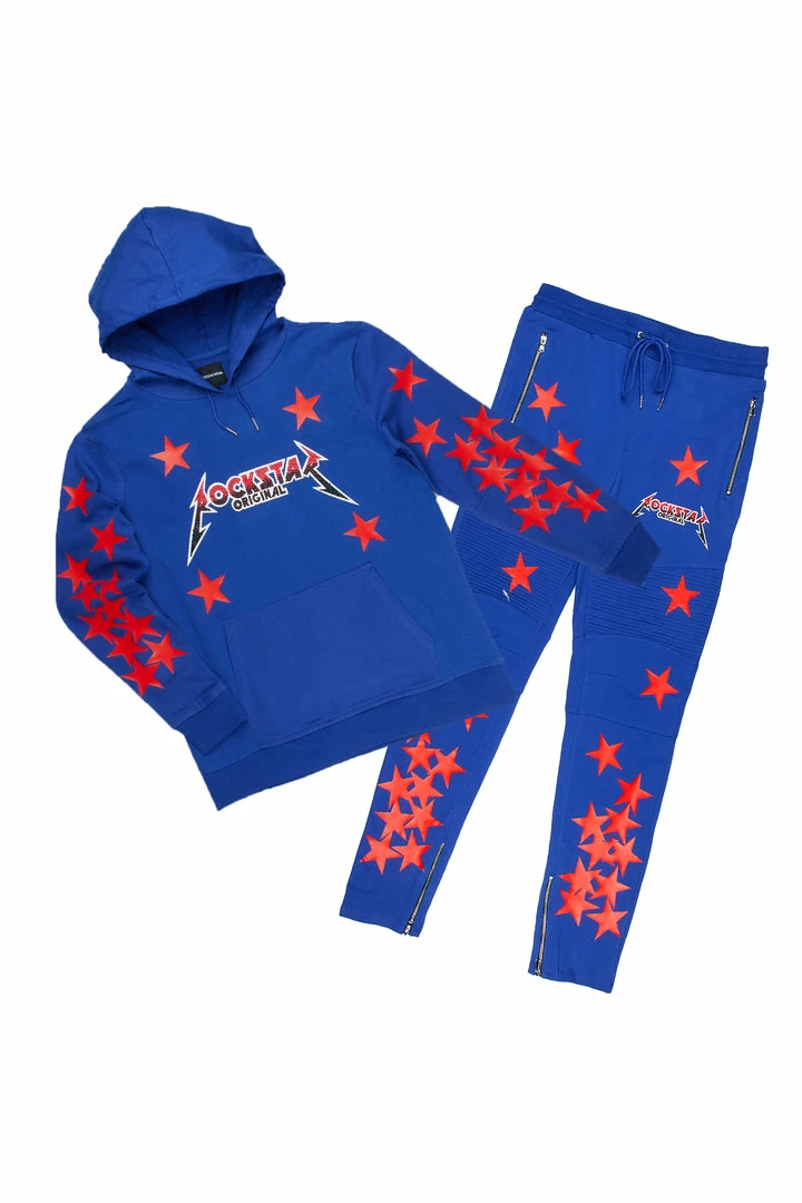 Rockstar Original Men’s two-piece tracksuit set in royal blue. Featuring aย multi color rhinestone RSO logo on the top and bottoms with printed star graphics throughout. Top accents a drawstring hood with a front pocket and bottoms accent a drawstring waistband, high quality zipper pockets with ankle zipper hems and a signature moto biker design.
