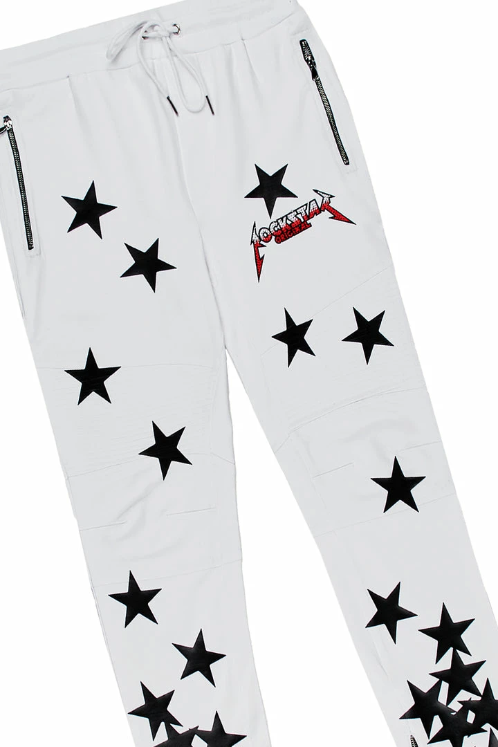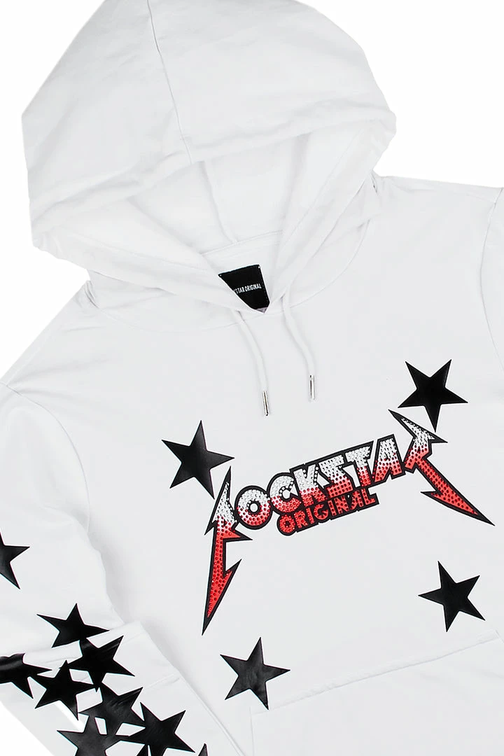 Rockstar Original Men’s two-piece tracksuit set in pure white. Featuring a multi color rhinestone RSO logo on the top and bottoms with printed star graphics throughout. Top accents a drawstring hood with a front pocket and bottoms accent a drawstring waistband, high quality zipper pockets with ankle zipper hems and a signature moto biker design.
