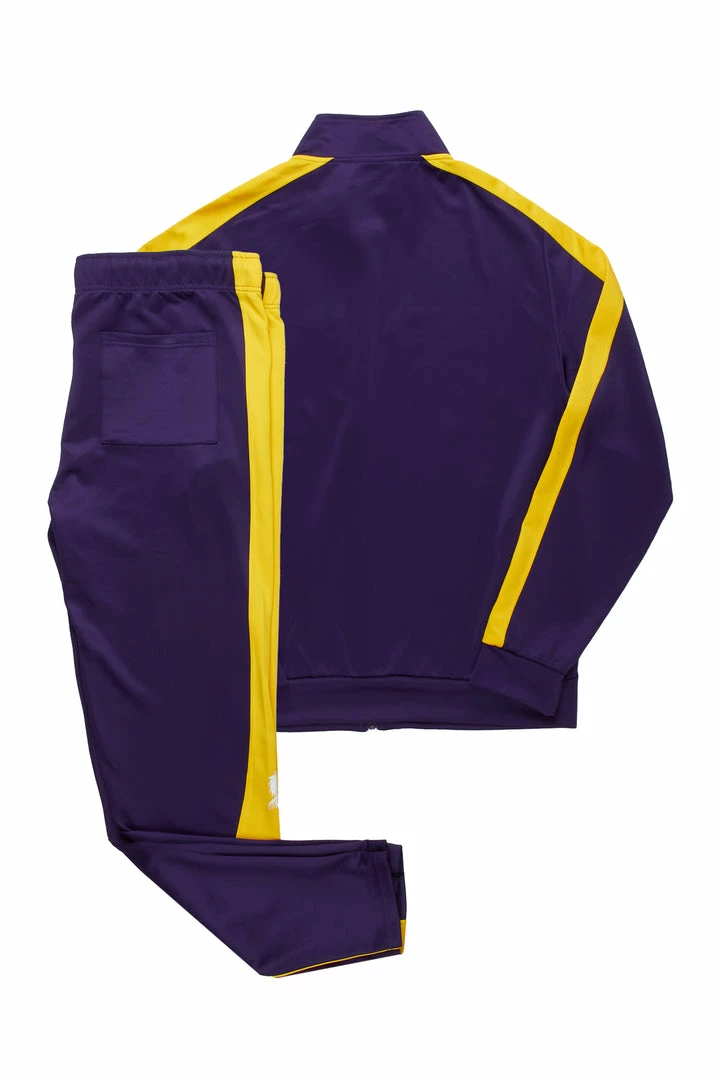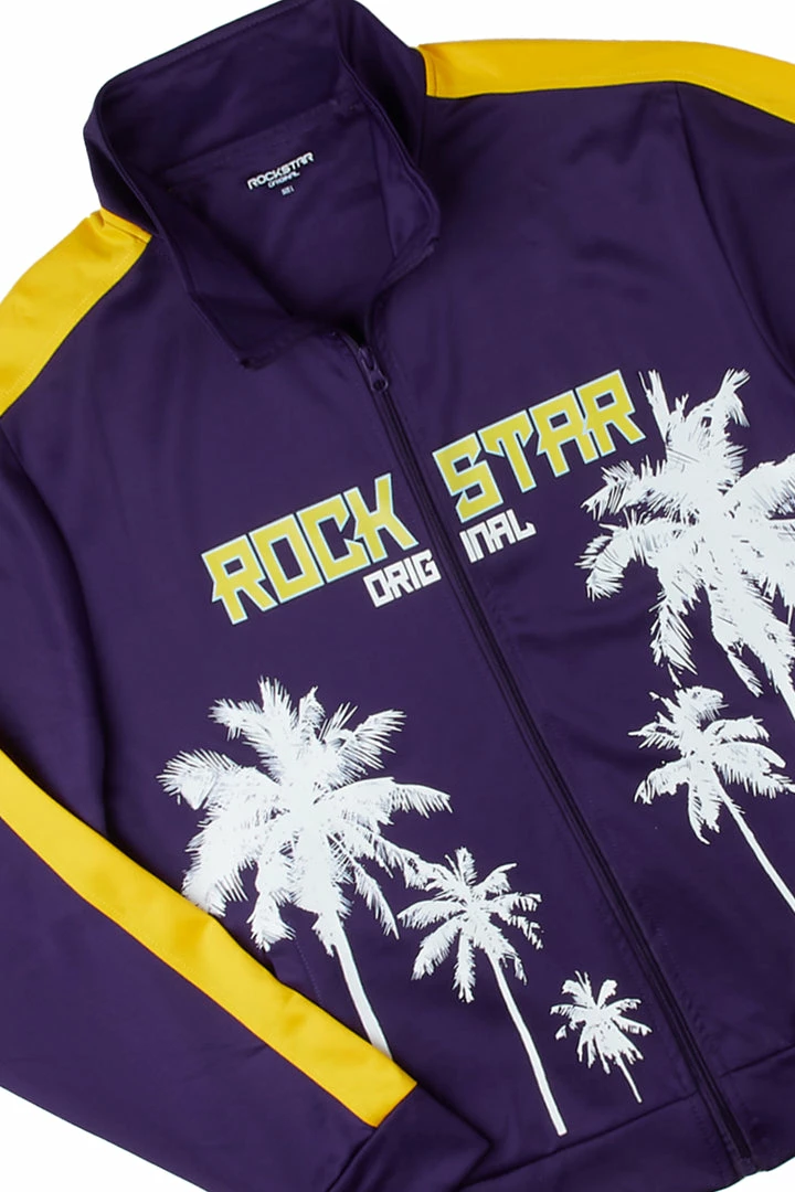 Rockstar Original Men’s two-piece tracksuit set in purple. Featuring printed RSO logos, a racer stripe finish and palm treeย graphics throughout. Designed as a lightweight wear with a high quality front zip stand-up collar closureย and side pockets while bottoms accent aย drawstring waistband, pockets throughout andย ankle zipperย inseams. Stay fresh with this effortless ‘fit.